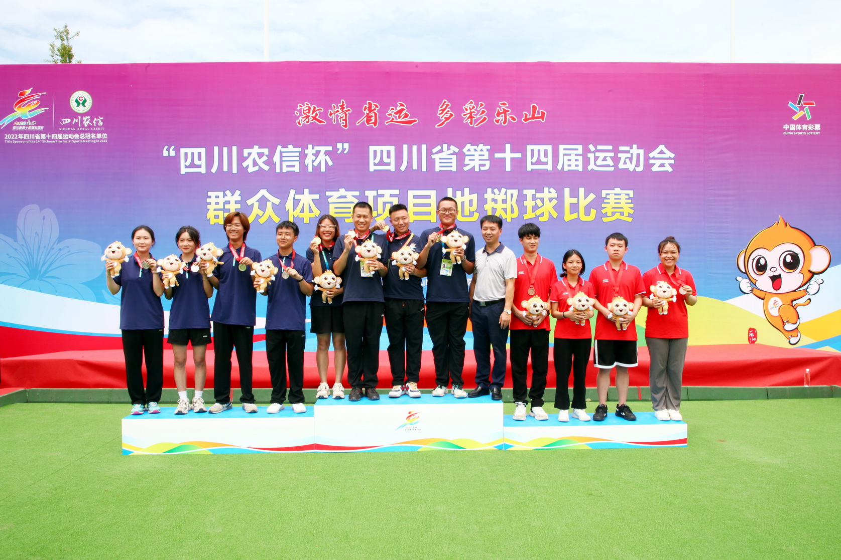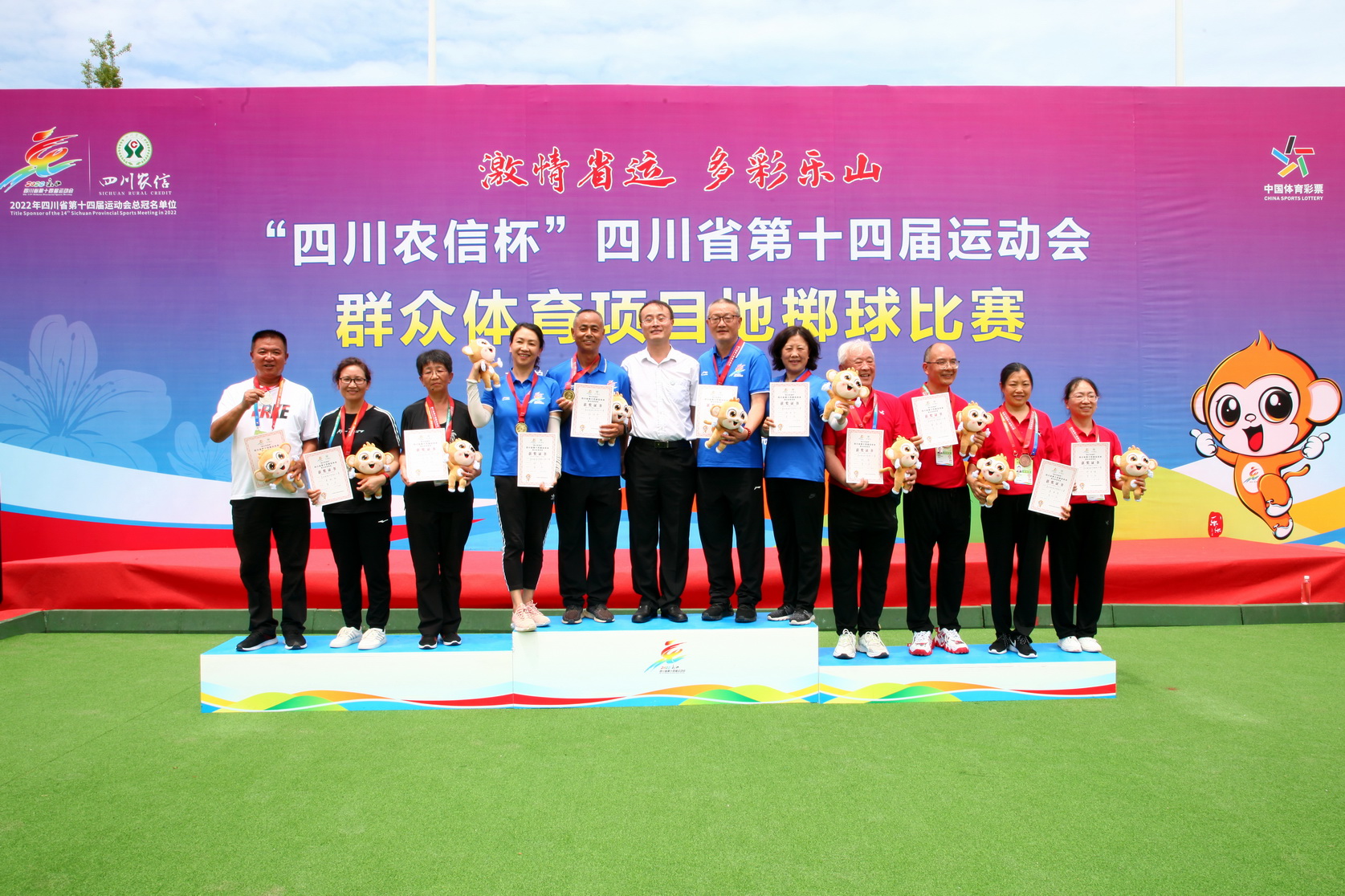 “草地掷球中年混合三人赛”第一名乐山队、第二名广元队、第三名绵阳队。