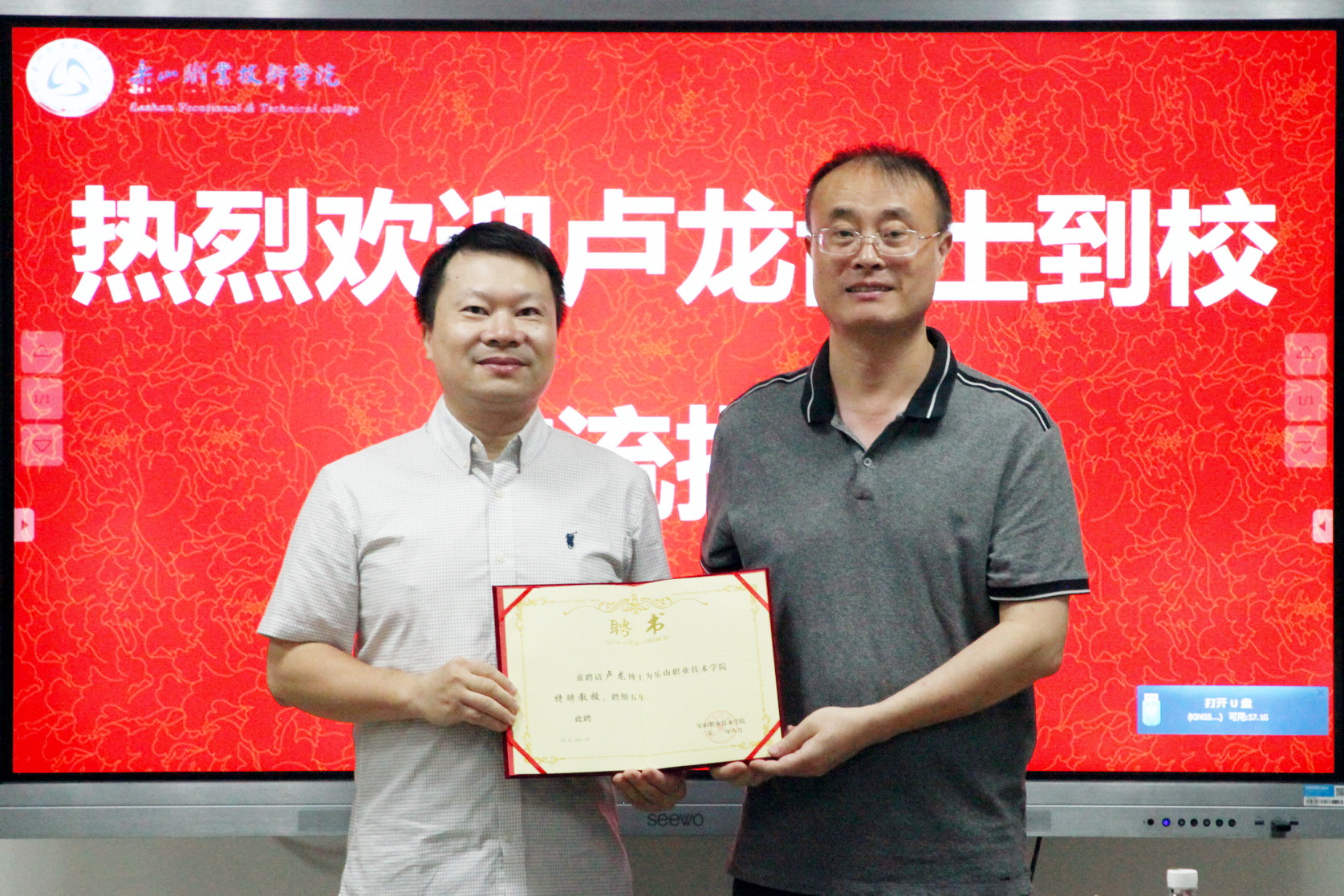陈芝海对卢龙博士一行莅临学院开展交流表示热烈欢迎。观看学院宣传片后,刘忠为卢龙博士现场颁发了“青江学者特聘教授”聘书。双方就“基于人工智能和多组学队列的儿童自闭症分型和早期诊断研究”合作项目开展深入讨论,在人才培养、项目合作等方面上达成了共识,组建起由卢龙博士领衔的跨学科、跨领域科研项目团队,并正式成立了“成渝地区双城经济圈健康大数据研究中心”。