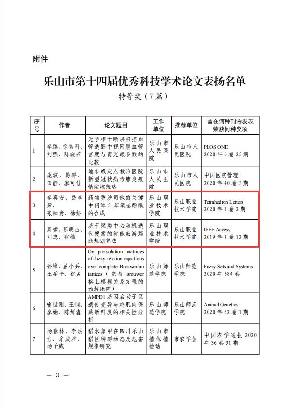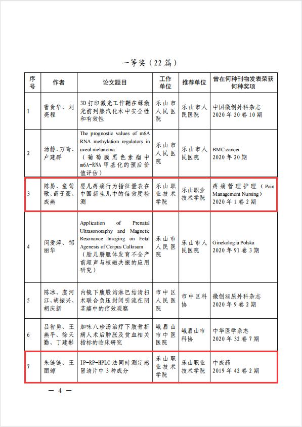 近日,经乐山市第十四届优秀科技学术论文专家评审组评审,BV伟德官方网站的《药物罗沙司他的关键中间体 5-苯氧基酚酞的合成》、《基于聚类中心动机迭代搜索的智能旅游路线规划算法》2篇论文获特等奖,《婴儿疼痛行为指征量表在中国新生儿中的信效度检测》等5篇论文获一等奖。