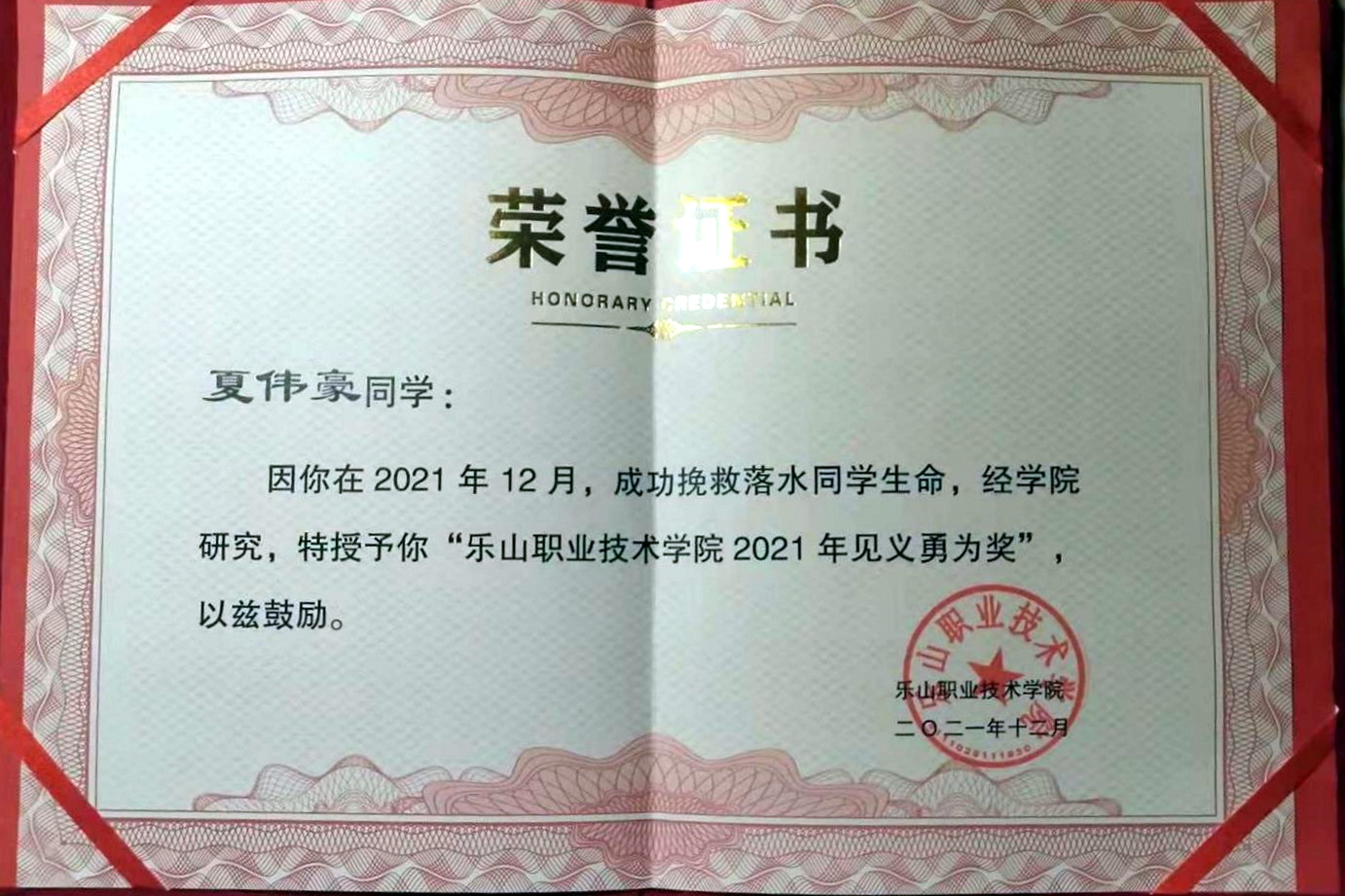 2021年12月27日晚,旅游系烹调工艺与营养21级1班夏伟豪同学被学院授予了“BV伟德官方网站2021年见义勇为奖”荣誉证书,并接受了奖金1000元,在场师生用最热烈的掌声向夏伟豪同学表示祝贺。