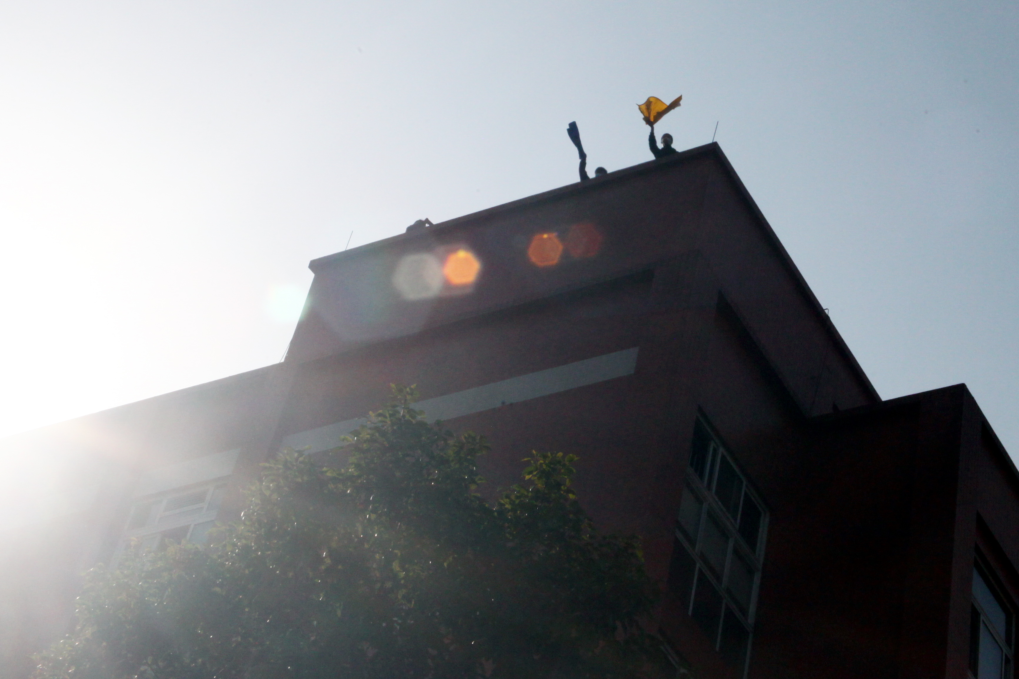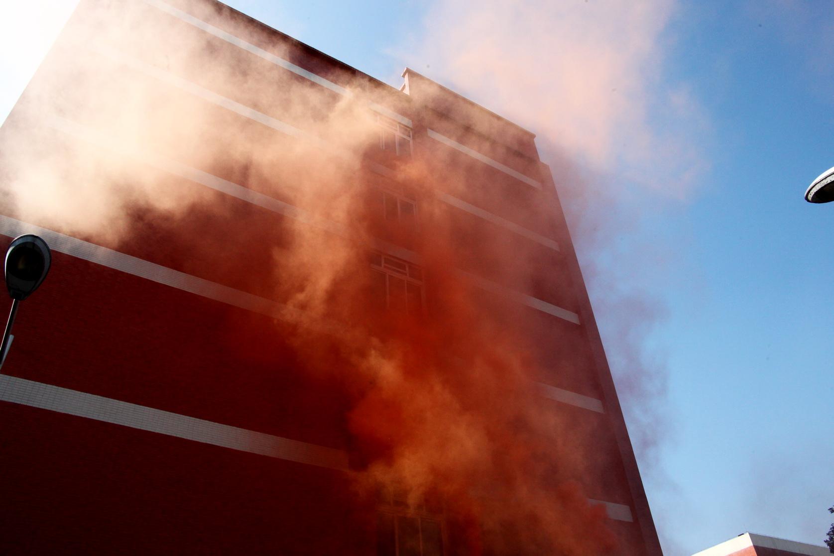 14时30分,火灾警报声响起,各楼宇内师生员工迅速拿起毛巾捂住口鼻有序撤离,学生从宿舍迅速撤离主运动场,各楼宇教职员工按照就近就便的原则,撤离到楼宇外的安全区域。