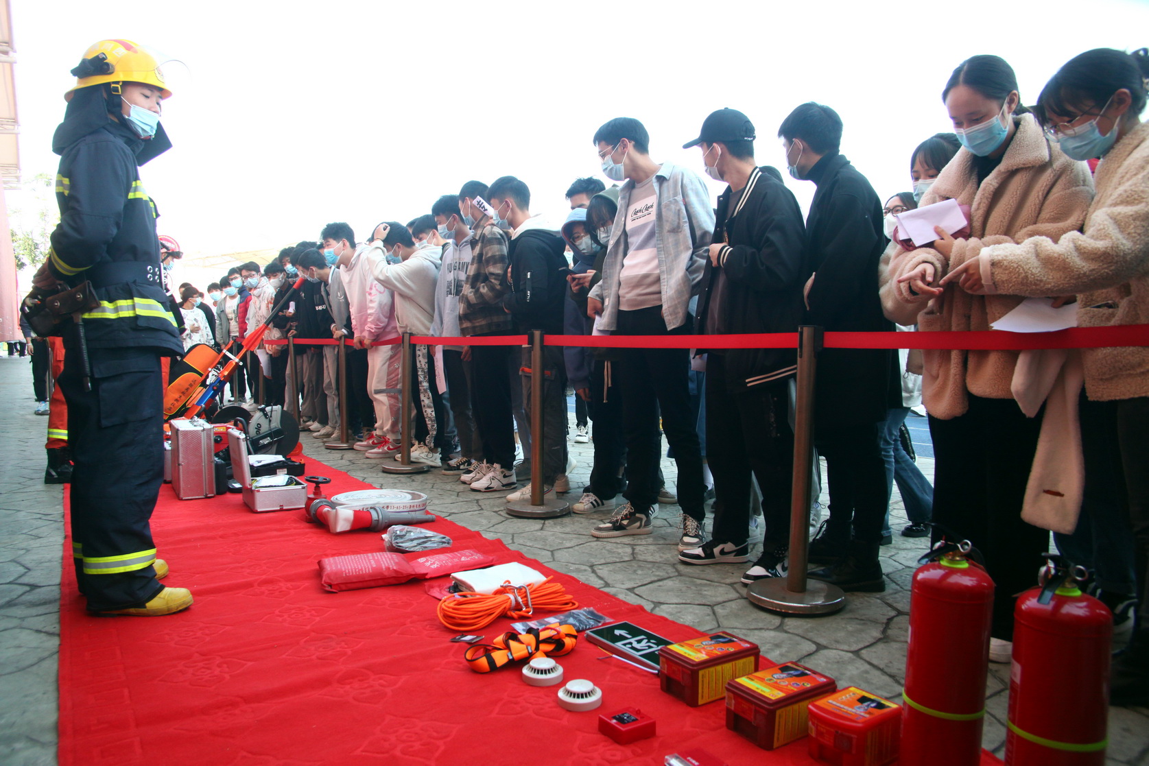 演练结束后,保卫处对学院首届志愿者消防队员进行了消防知识培训,并组织参观了消防器材展示活动。