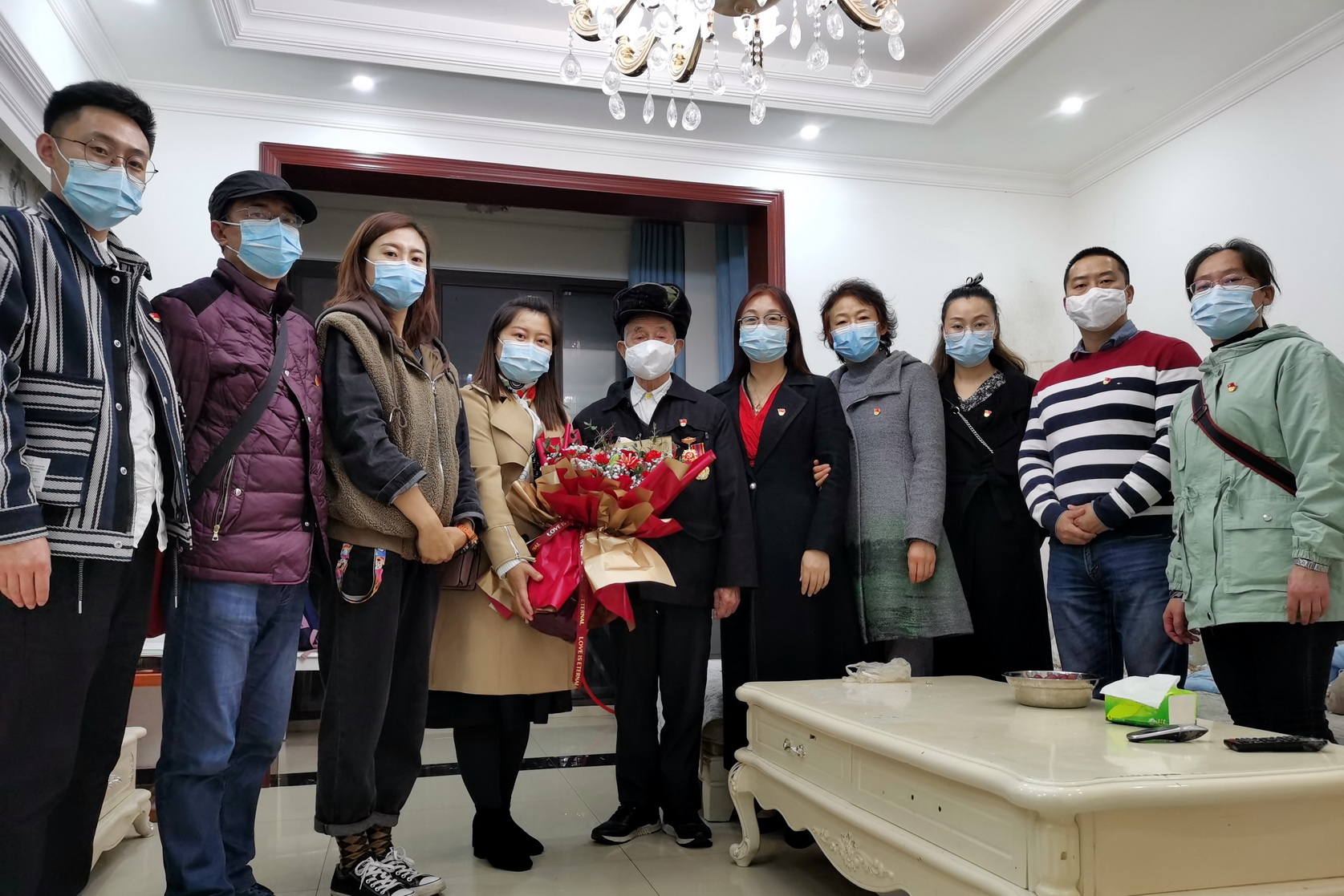活动的第二项内容是看望抗美援朝退伍英雄许泽林老人。支部一行于当晚7点来到许泽林老人家中,为其献上鲜花和慰问金,感谢老英雄为我们今天的安定幸福生活所做的贡献。许泽林老人精神状态很好,他主动向我们谈起自己的战斗经历。许泽林老人于1951年3月28日晚10点作为15军44师炮兵营的一名志愿军战士进入朝鲜展开对敌作战,为保家卫国在朝鲜整整浴血奋战了三年,直至1954年5月1日才返回祖国。当回忆起自己的战斗岁月时,老人表现得十分轻松,他表示三年中自己多次与死亡擦肩而过,相比牺牲的众多战友,能活着回来实属幸运,所以此生非常知足。而当我们对他当年的奉献表示感谢时,老人突然变得沉重起来,嘴唇颤抖,不停地说最该感谢和被深刻怀念的是那些没有回来的我的战友们,他们才是真正的英雄,没有他们就没有我们的今天。此时老人眼里噙满泪水,而这一幕让在场的同志们为之动容。