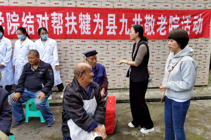 在九九重阳节来临之际,为贯彻落实《乐山市市级部门(单位)结对帮扶养老(儿童)机构工作方案》文件精神,学院党委副书记陈芝海带队,机关一支部、四支部26名党员,1名心理辅导老师,以及医护系2名老师、5名学生志愿者前往犍为县九井敬老院开展慰问帮扶活动。