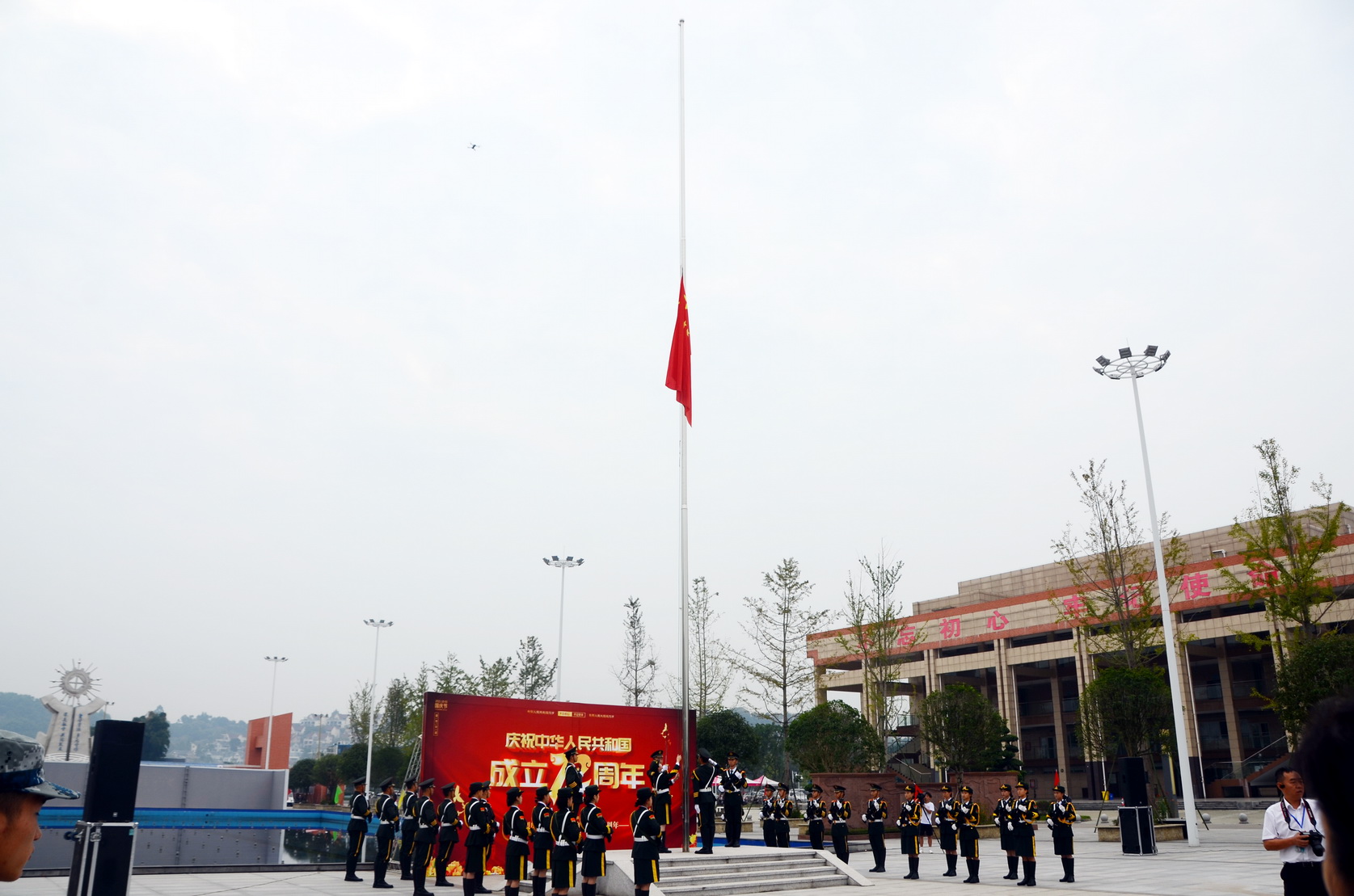 伴随着嘹亮的口号声,护旗队迈着整齐的步伐,护送国旗到达升旗台。在雄壮的《义勇军进行曲》中,全体人员对国旗行注目礼,目送鲜艳的五星红旗冉冉升起,迎风飘扬。