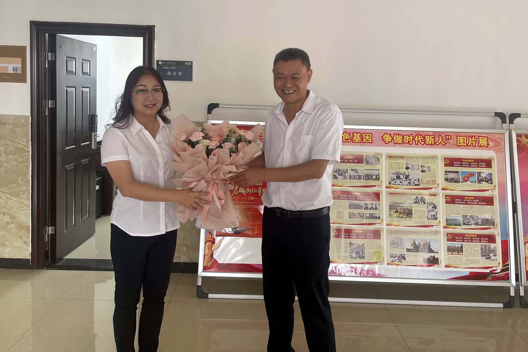 今年是第三十七个教师节,学院教师陆陆续续收到了一份特别的教师节礼物——一束鲜花和院领导暖心的问候。学院领导纷纷走进了课堂,为一线教师送上节日祝福和鲜花。一次看似简单的送花仪式,带给教师们的不仅是自我价值感的体现,更是乐职院大家庭对默默坚守在教育事业一线的教师们的关怀和温暖。