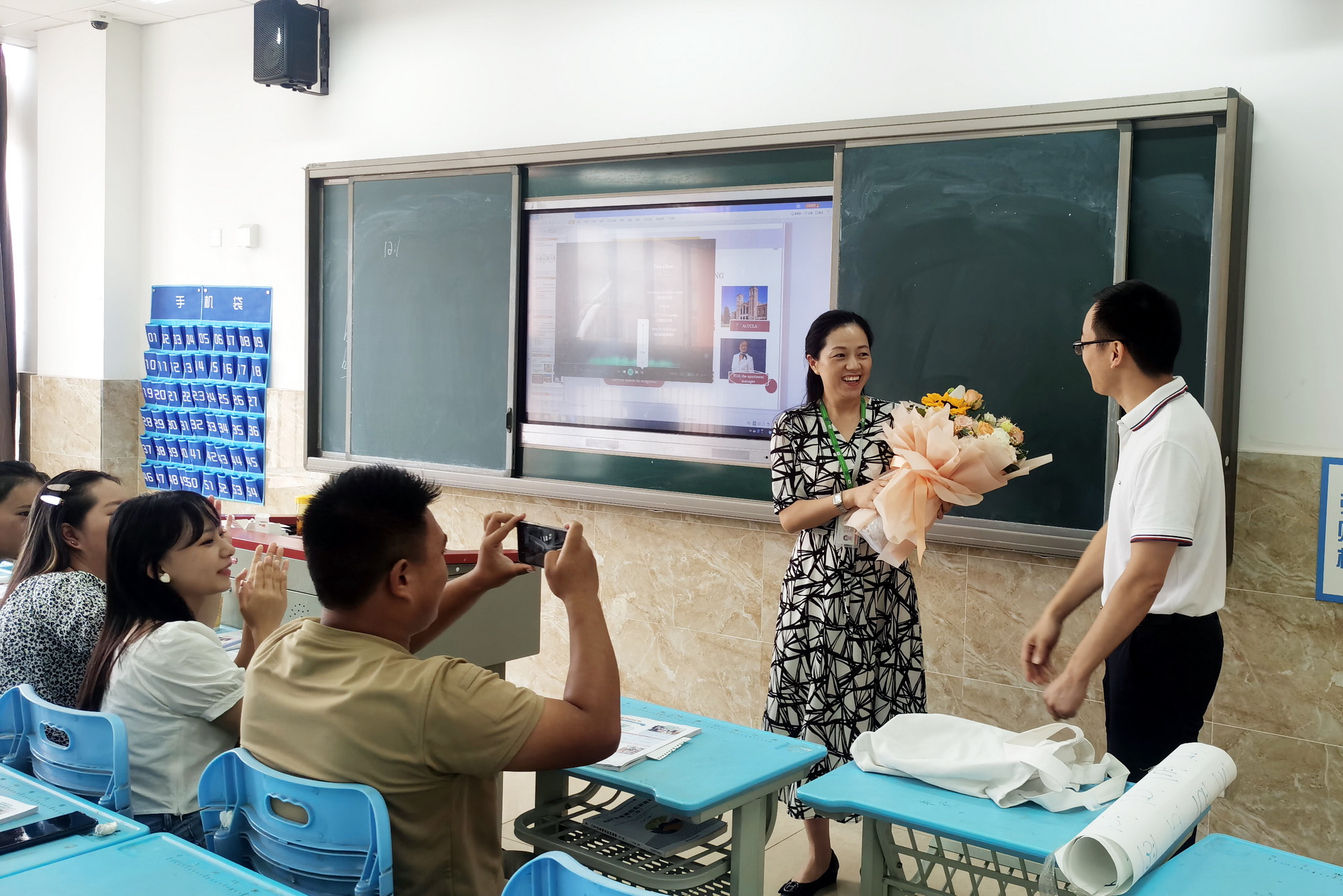 “鲍老师,您辛苦了,节日快乐!” 9月10日教师节一早,学院党委书记易群走进了4号实训楼306教室,将手里捧的一束鲜花递给了财经管理系青年教师鲍敏的手中。“好漂亮呀!没想到教师节当天能收到易书记送的鲜花,太惊喜了。”鲍老师开心地接过易书记送的鲜花,同学们也及时献上了祝福的掌声。