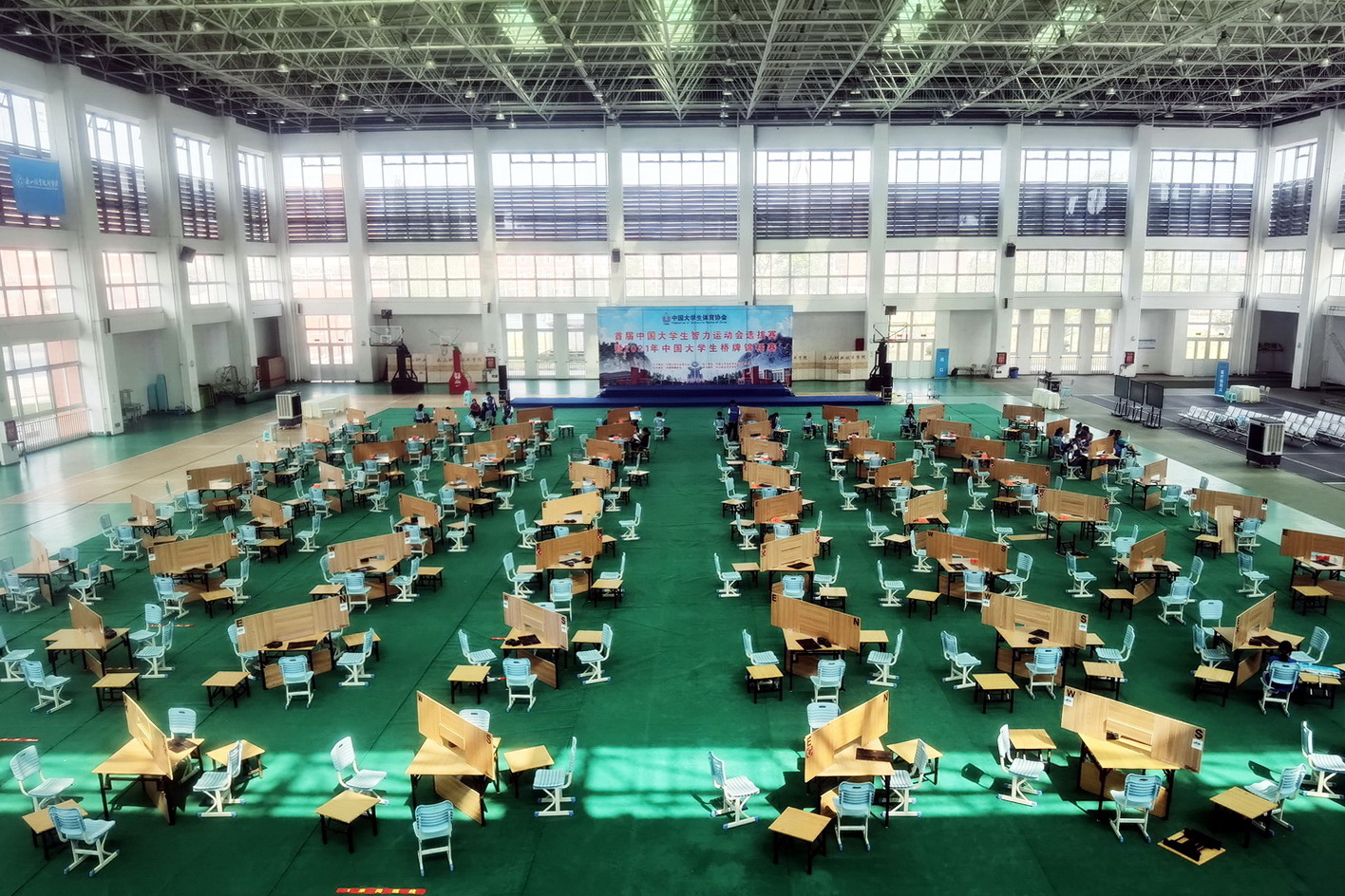 7月21日-22日,学院多个部门正在紧锣密鼓地布置准备,场地布置就绪,虚位以待即将抵达的43所高校的437名大学生运动员。