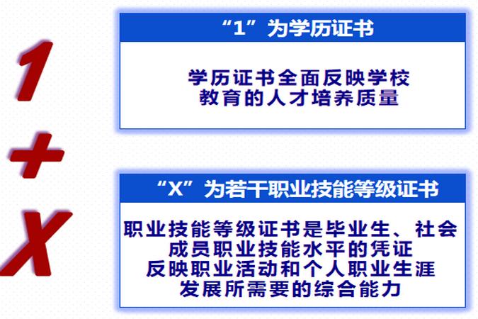 1+X证书制度,即在职业院校、应用型本科高校,启动学历证书+若干职业技能等级证书制度试点,其中的“1”为学历证书,“X”为若干职业技能等级证书。1+X证书制度,意味着学生从职业院校毕业时,可以同时领到多张技能等级证书,各类职业技能等级证书具有同等效力,持有证书人员享受同等待遇。