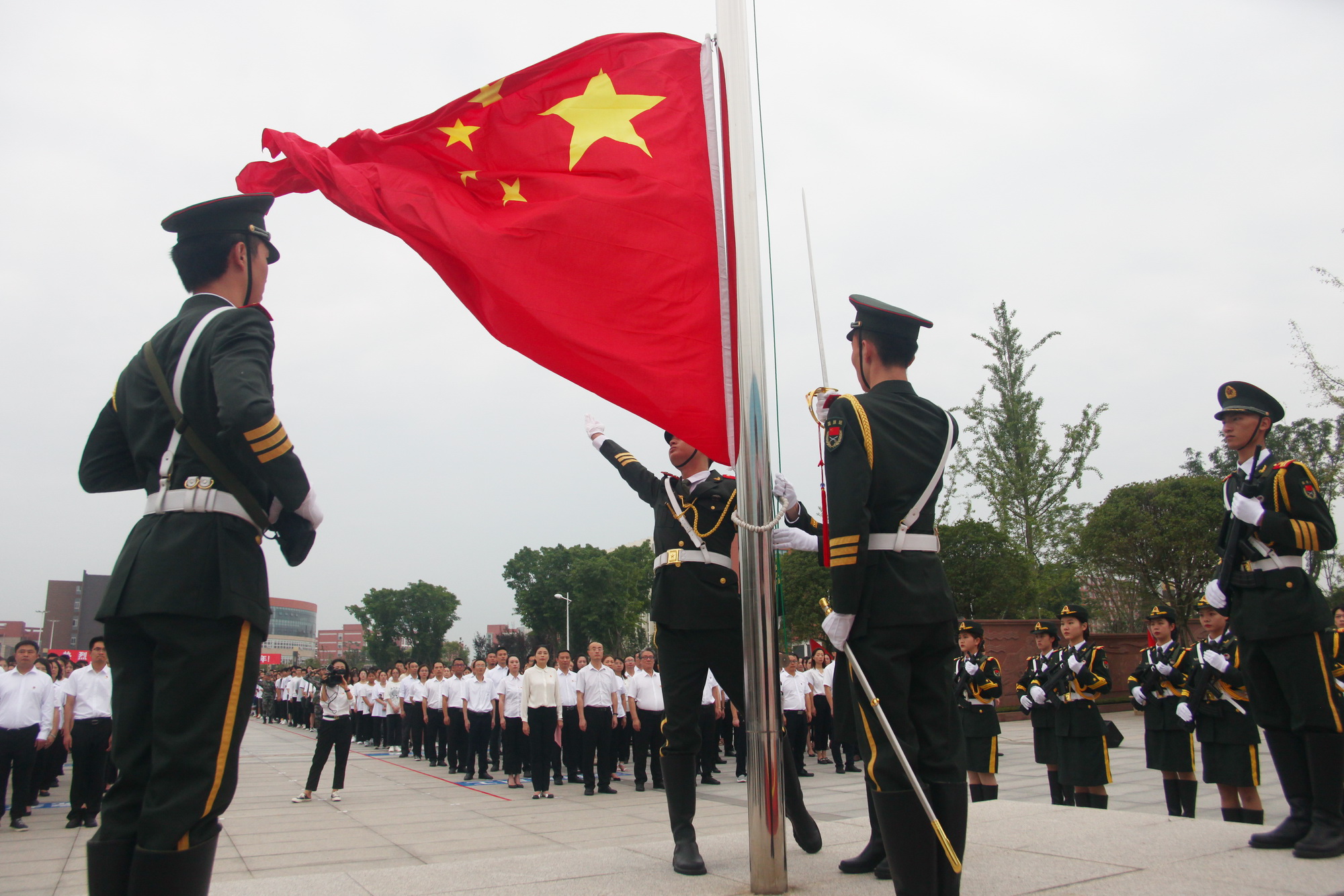 鲜艳的五星红旗冉冉升起,庄严的国歌唱响校园。