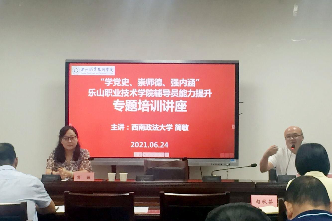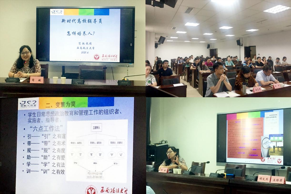2021年6月24日上午,BV伟德官方网站党委学生工作部在行政楼401会议室举办了“学党史、崇师德、强内涵”辅导员能力提升专题讲座。全国“最美”辅导员、重庆市教授型专职辅导员、西南政法大学简敏教授以“新时代高校辅导员如何培养人”为主题做了专题报告。学院各系(部)党总支专职副书记、学工办老师、全体专兼职辅导员共70余人参加了讲座。讲座由党委学生工作部部长胡文杰主持。