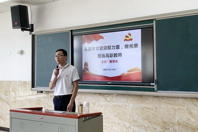 鲍学东以“从百年党史汲取力量,做光荣担当高职教师”为题,围绕三个方面展开。一是重温职业教育峥嵘百年,科学审视职业教育的重要地位。结合我院办学历史,鲍学东指出,职业教育是国民教育体系和人力资源开发的重要组成部分,我们党历来高度重视,职业教育前途广阔、大有可为。二是系统分析办好职业教育的历史经验。鲍学东分析到,办好职业教育,要坚持党的领导,坚持服务发展、促进就业的办学方向,坚持立德树人。三是学习百年党史,明确责任担当。结合全国职业教育大会精神和习近平总书记关于职业教育的重要指示精神,鲍学东指出,作为高职教师要在思想提升上用心、在教学理念上用情、在教学改革上用力,以无上光荣的初心和使命感学史力行,在新时代勇担作为。