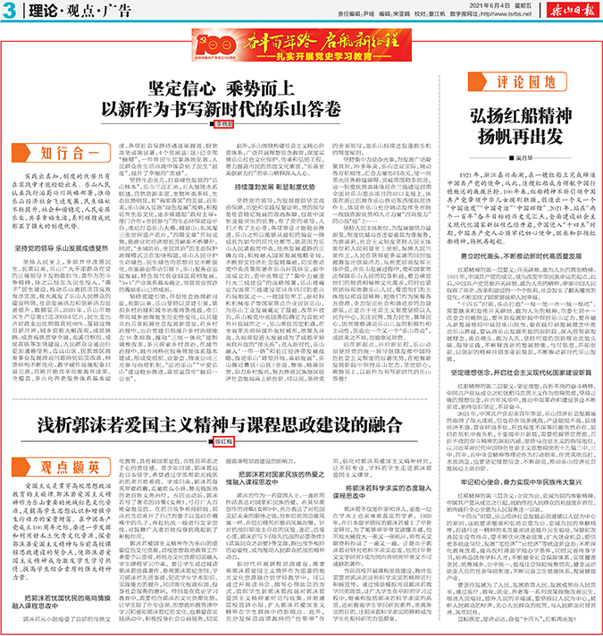 2021年6月4日,《乐山日报》“理论•观点•广告”专栏,刊发了BV伟德官方网站马克思主义学院李晓勤、徐红梅老师的两篇署名文章,充分肯定了学院的党史学习研究成果。