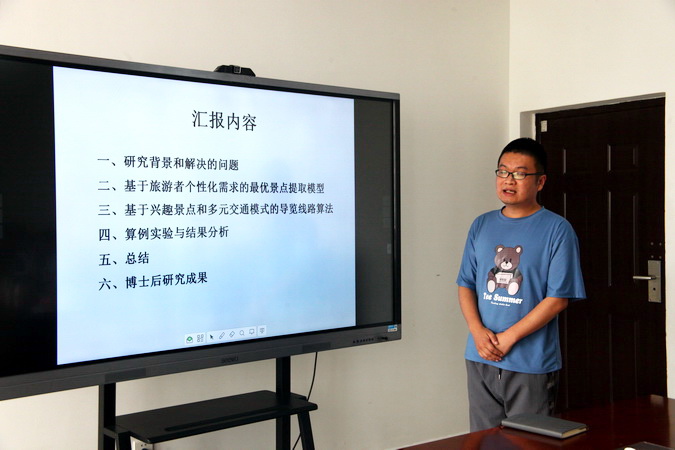 课题报告汇报评议由专家组组长邱云志教授主持。博士后导师刘忠教授做了周啸博士入站基本情况的介绍后,周啸博士针对“基于游客中心点聚类的智能导览线路算法研究”课题,从课题研究的背景、研究现状和有待解决的问题、基于旅游者个性化需求的最优景点提取模型、基于兴趣景点和多元交通模式的导览线路算法、算例实验与实验结果分析、课题研究成果总结做了课题研究的汇报。同时汇报了2019年7月入站后两年内发表的学术论文,主持立项的课题。