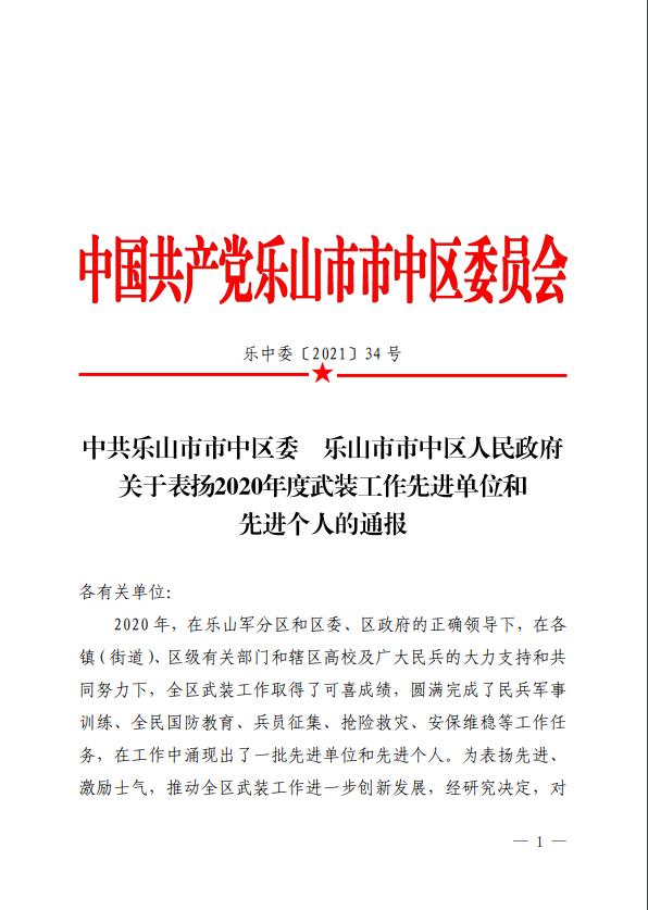 5月13日,乐山市市中区委、区政府下发《关于表扬2020年度武装工作先进单位和先进个人的通报》文件。文件表扬了在2020年圆满完成了民兵军事训练、全民国防教育、兵员征集、抢险救灾、安保维稳等武装工作任务,在年度武装工作中涌现出的先进单位和先进个人。