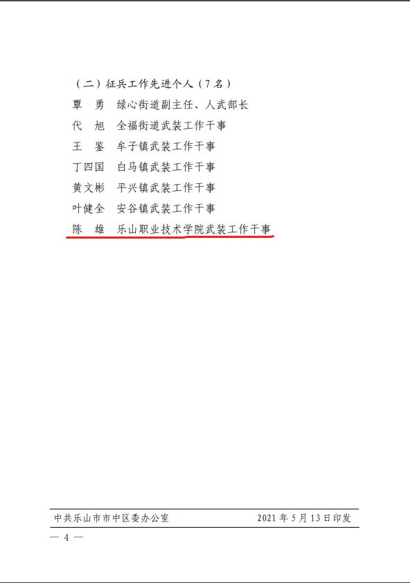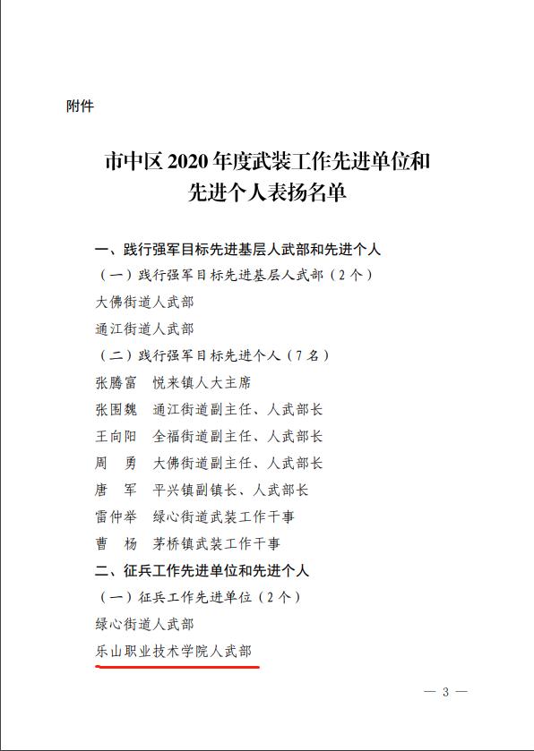 BV伟德官方网站党委武装部再次被市中区委、区政府通报表彰为征兵工作先进单位,学院党委武装部陈雄被评为征兵工作先进个人。乐山市市中区仅有两个单位获此殊荣。