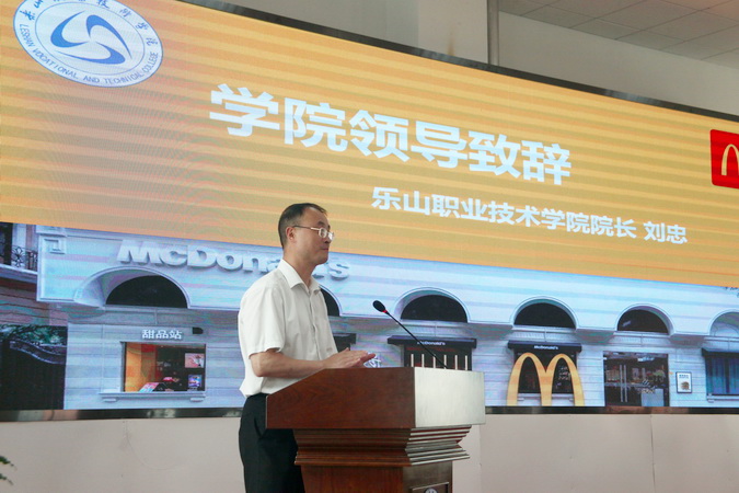 刘忠在典礼上致辞,对麦当劳负责人的到来表示热烈欢迎,对2018级首届麦当劳现代学徒班的毕业生顺利完成学业、踏上新征途表示祝贺,并对2020级新学徒的加入送上了衷心的祝福。