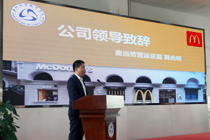 韩光明在致辞中,表达了深化校企合作的展望和对同学们的期许,期待更多的同学投入连锁餐饮事业中来。
