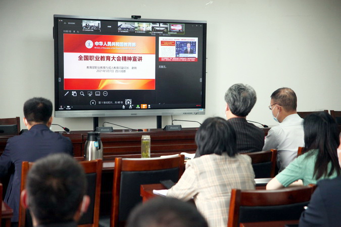 2021年5月7日上午,全国职业教育大会精神宣讲会在成都召开,教育部职业教育与成人教育司副司长谢俐在四川省教育厅主会场进行了宣讲。学院院领导、全体中层干部、部分教师代表在行政楼401会议室参加了这场视频会议。