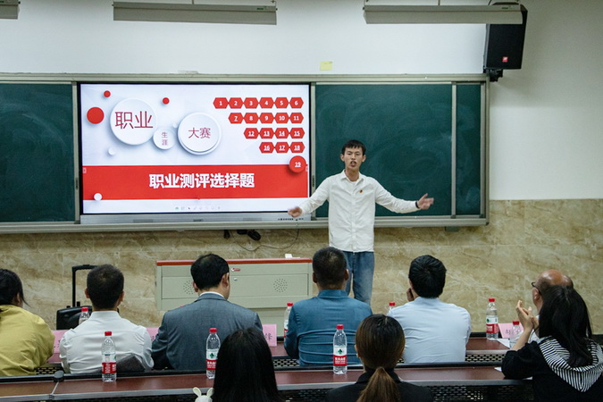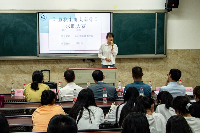 此次决赛分为主赛道和退役军人暨残疾学生专项赛道两部分,来自全院8个系共9名选手通过了各系初赛后杀入决赛齐聚于此。比赛赛程分为自我介绍、才艺展示、职场亮剑和争分夺秒四个环节。为保证比赛的公平公正,让同学们在实战中体验到职业竞争的真实感受,学工部邀请了乐山市本地实力雄厚且分属不同行业的各大用人企业人力资源分管副总和部门主管来担任决赛评委,在等待比赛开始的过程中,我们已经从选手们紧张的表情中感受到了空气中弥漫着一丝竞争的残酷。