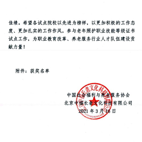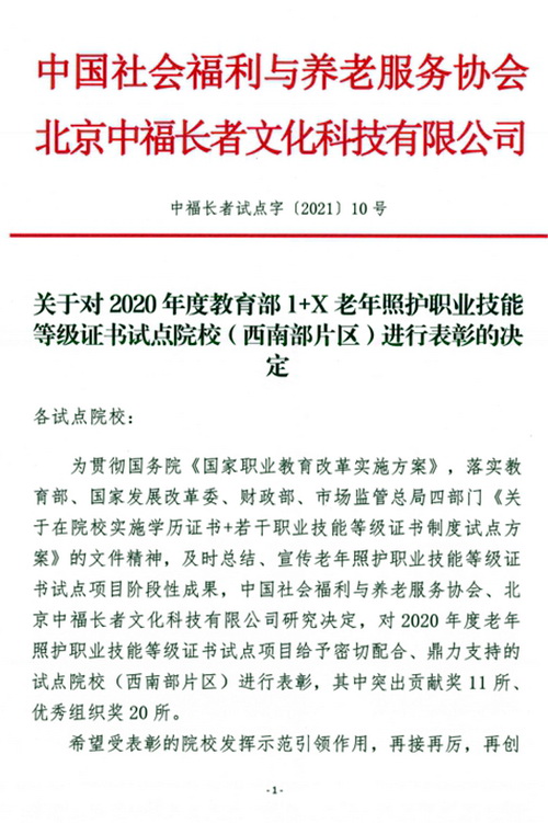 近日,学院收到中国社会福利与养老服务协会《关于对2020年度教育部1+X老年照护职业技能等级证书试点院校(西南部片区)进行表彰的决定》,决定授予BV伟德官方网站老年照护职业技能等级证书试点工作“突出贡献奖”。