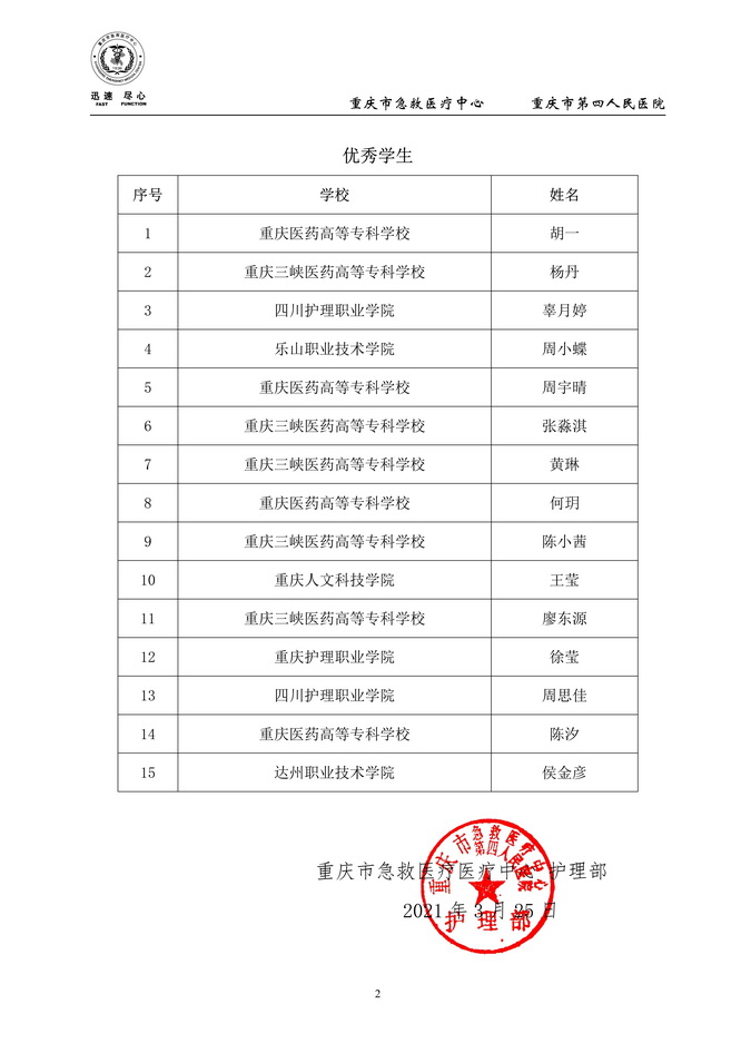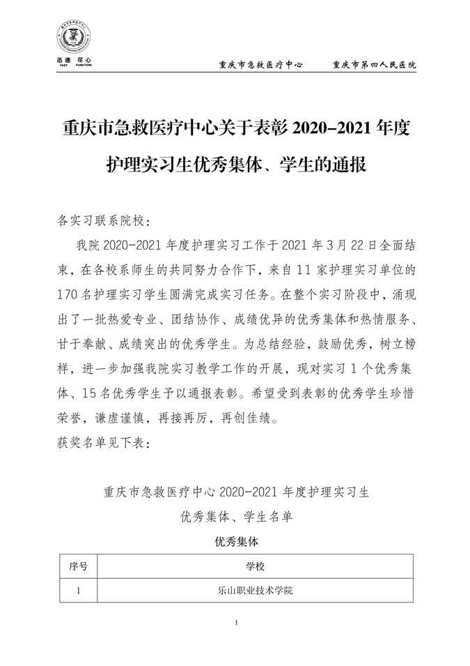 重庆市急救医疗中心护理部来函,将BV伟德官方网站实习生评为“2020-2021 年度护理实习生优秀集体”,周小蝶被评为“优秀学生”。