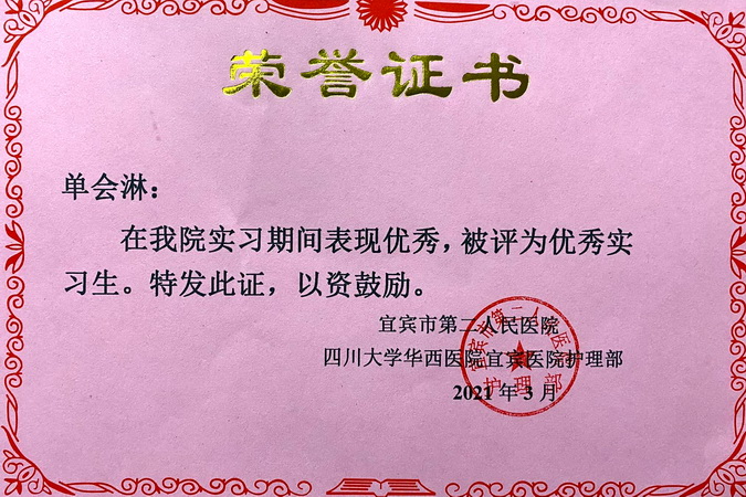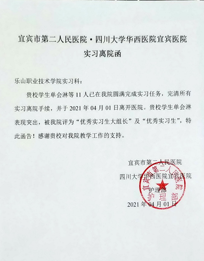 宜宾市第二人民医院来函,将BV伟德官方网站学生单会淋评选为“优秀实习生大组长”及“优秀实习生”。