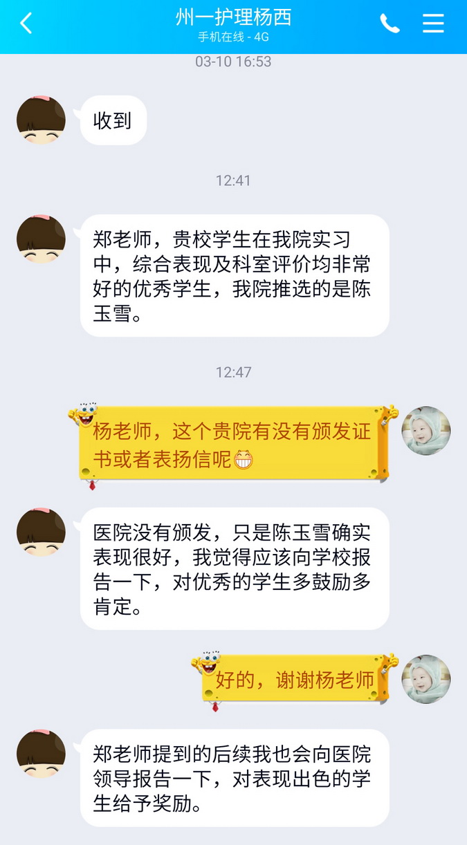 而凉山州第一人民医院的负责同志则通过QQ联系到学院护理系负责实习工作的同志,说他们医院虽然没有对优秀实习生进行官方评选,然而他们实在是喜欢BV伟德官方网站护理系的同学,特别提到了实习生组的大组长陈玉雪同学“确实表现很好”。