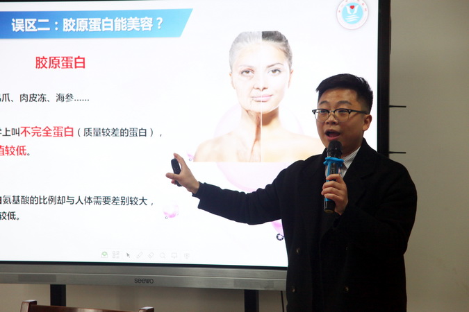 陈红洁擅长慢性疾病(高血压、糖尿病、高血脂、痛风等)、肿瘤患者、体重异常者(消瘦、肥胖)的营养治疗和管理,以及孕产妇、儿童的营养指导和调理。本次讲座以“饮食误区1:蜂蜜润肠通便很健康?”为题精彩开讲,接着详细介绍了胶原蛋白能美容?红枣、红糖最补血?喝骨头汤很补钙?豆浆不能和鸡蛋一起吃?海鲜和水果一起吃容易中毒?等13个饮食误区。通过具体实例,陈红洁让师生们了解健康知识,对疾病的预防和保健起到了积极作用。