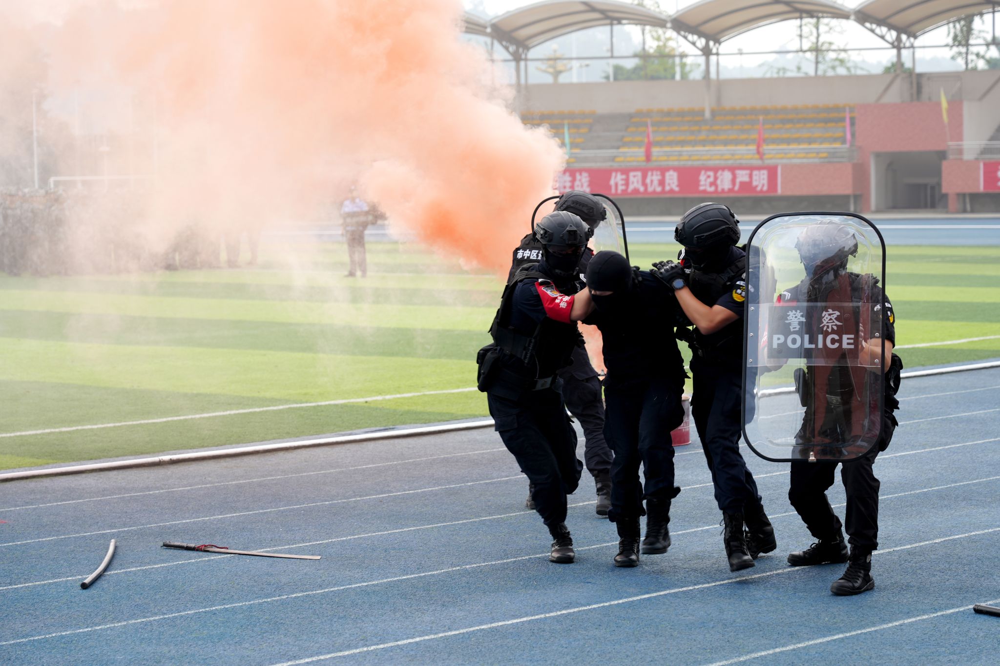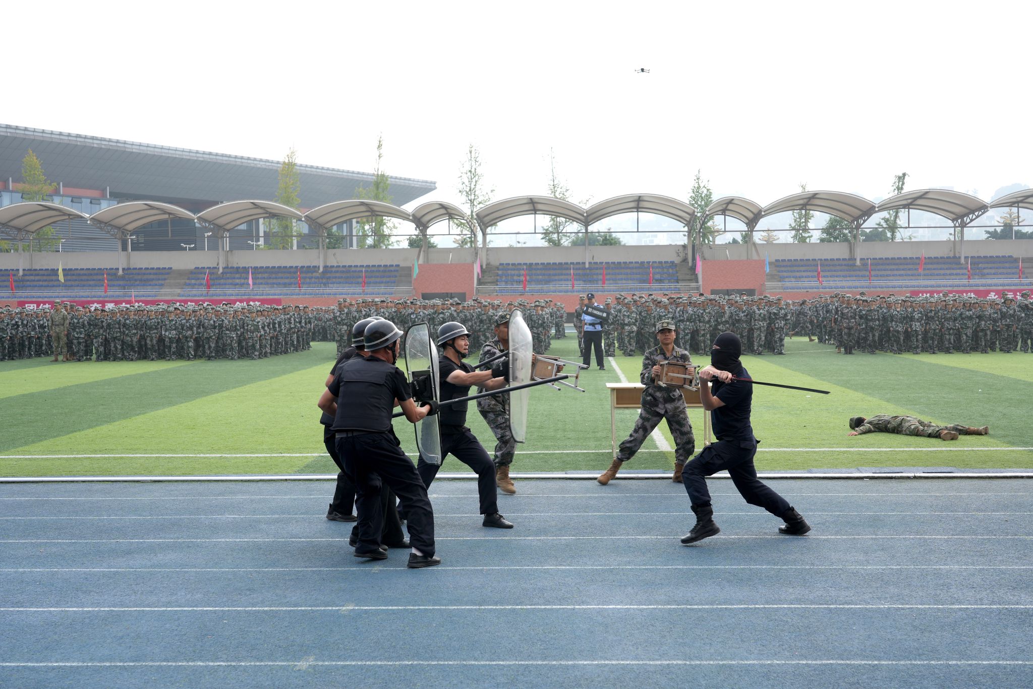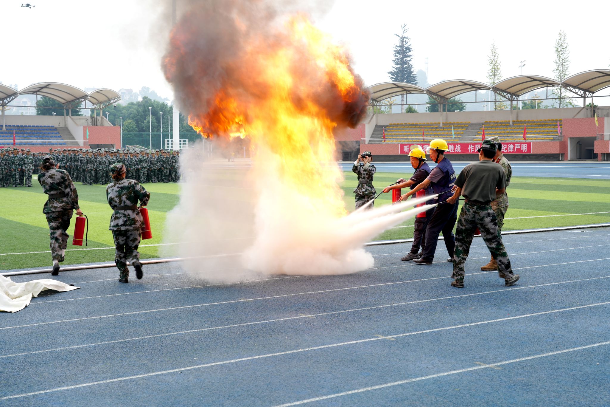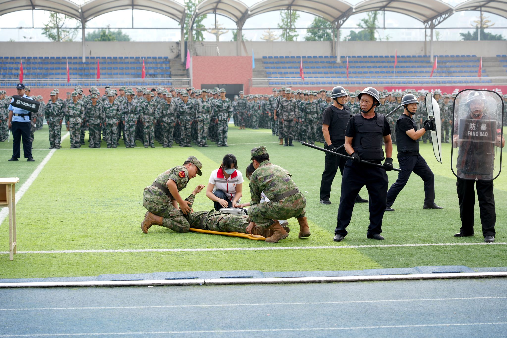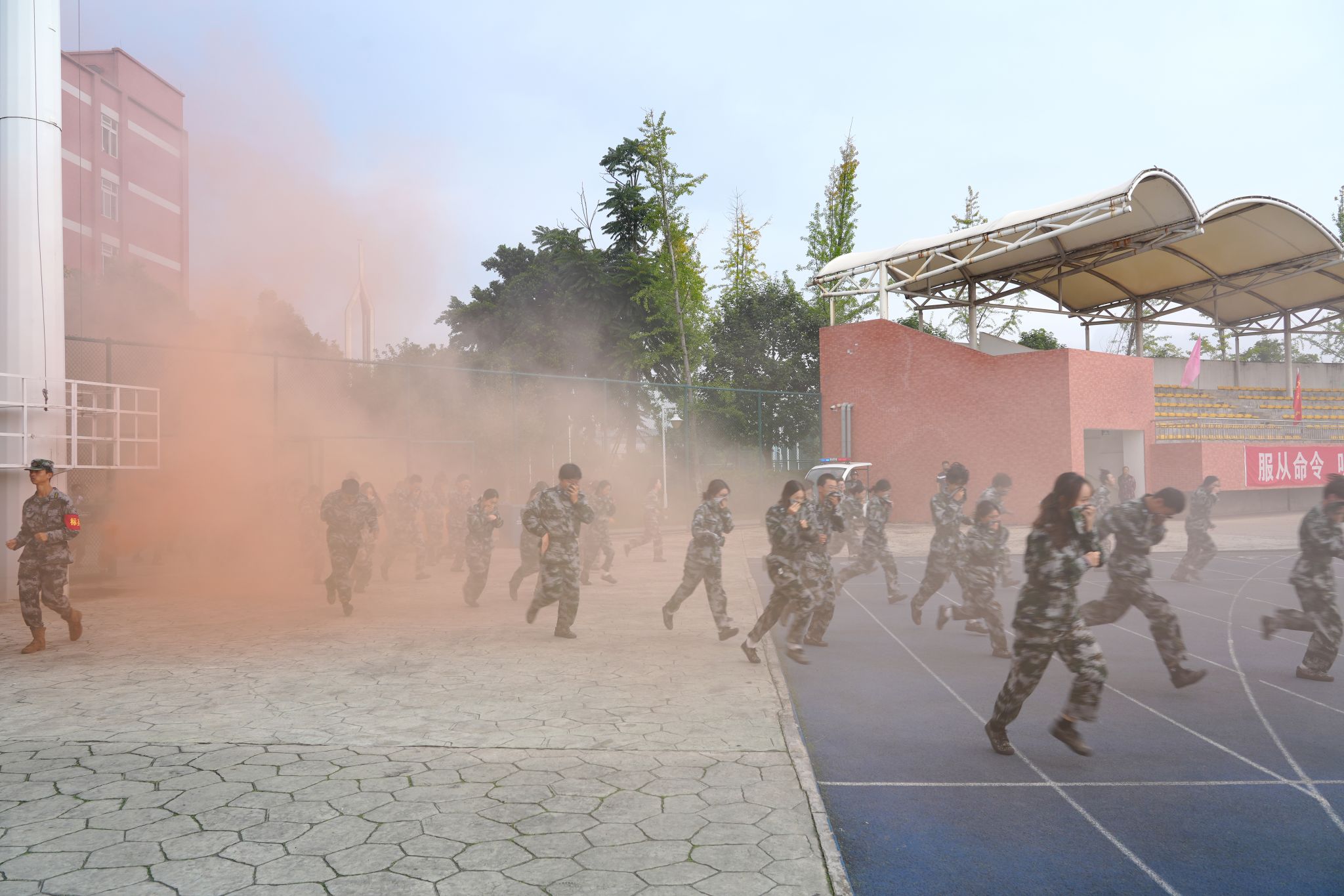 上午九时,军训总结大会正式拉开序幕。首先按年度军训实施方案要求依次进行了应急疏散、反恐防暴、医疗救护、实战灭火现场演练。伴随着激昂的《分列式进行曲》,在国旗方队的护卫下,9个分列式受阅方阵迈着铿锵有力的步伐依次入场。同学们身着统一的迷彩服,精神抖擞,口号嘹亮,动作整齐划一,挺拔的身姿、坚定的眼神,充分展现了新时代的乐职青年学子,经过军事训练洗礼后的过硬作风和蓬勃朝气。一个个方阵如同一块块移动的“钢铁长城”,依次经过主席台接受检阅。