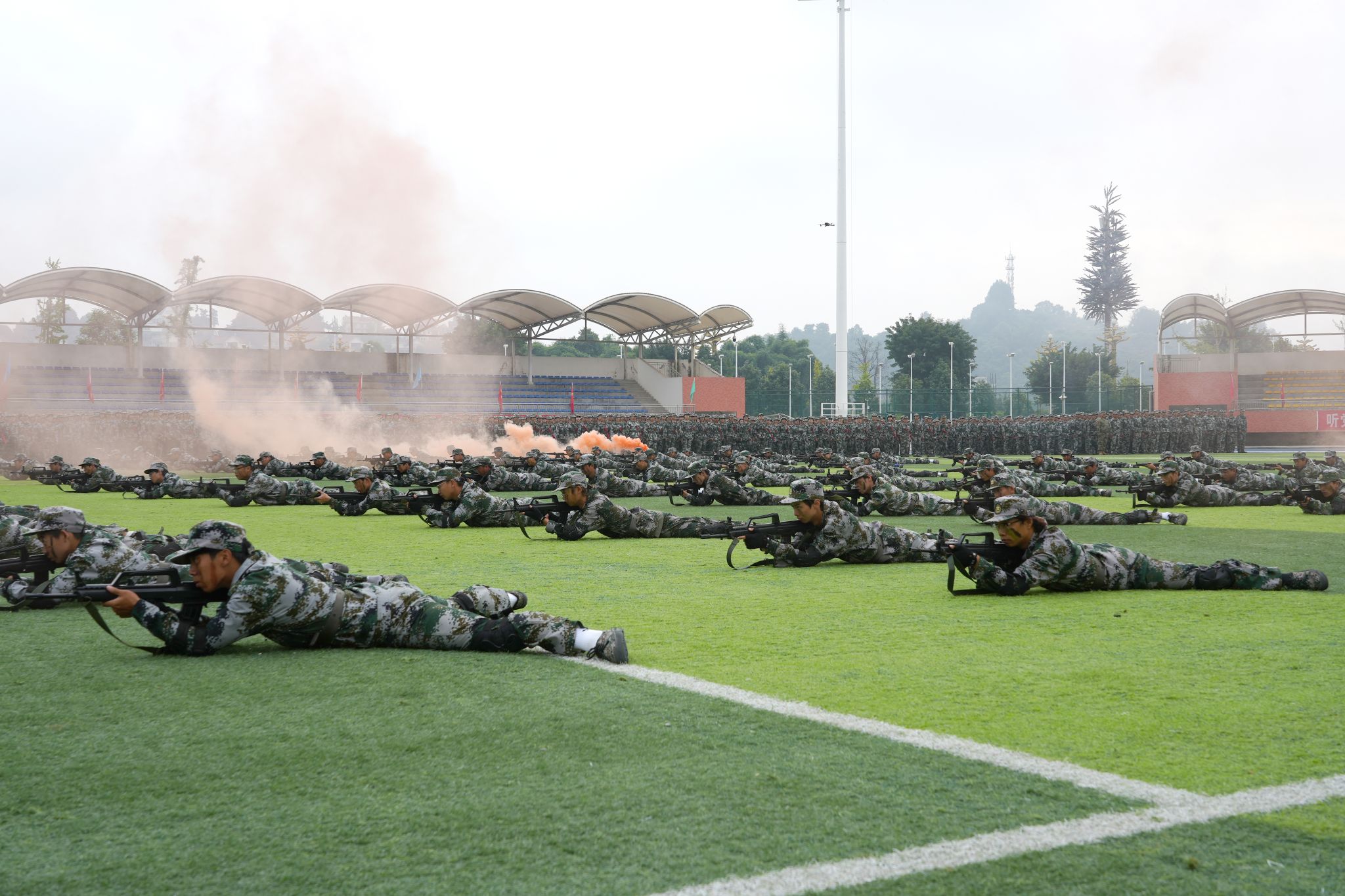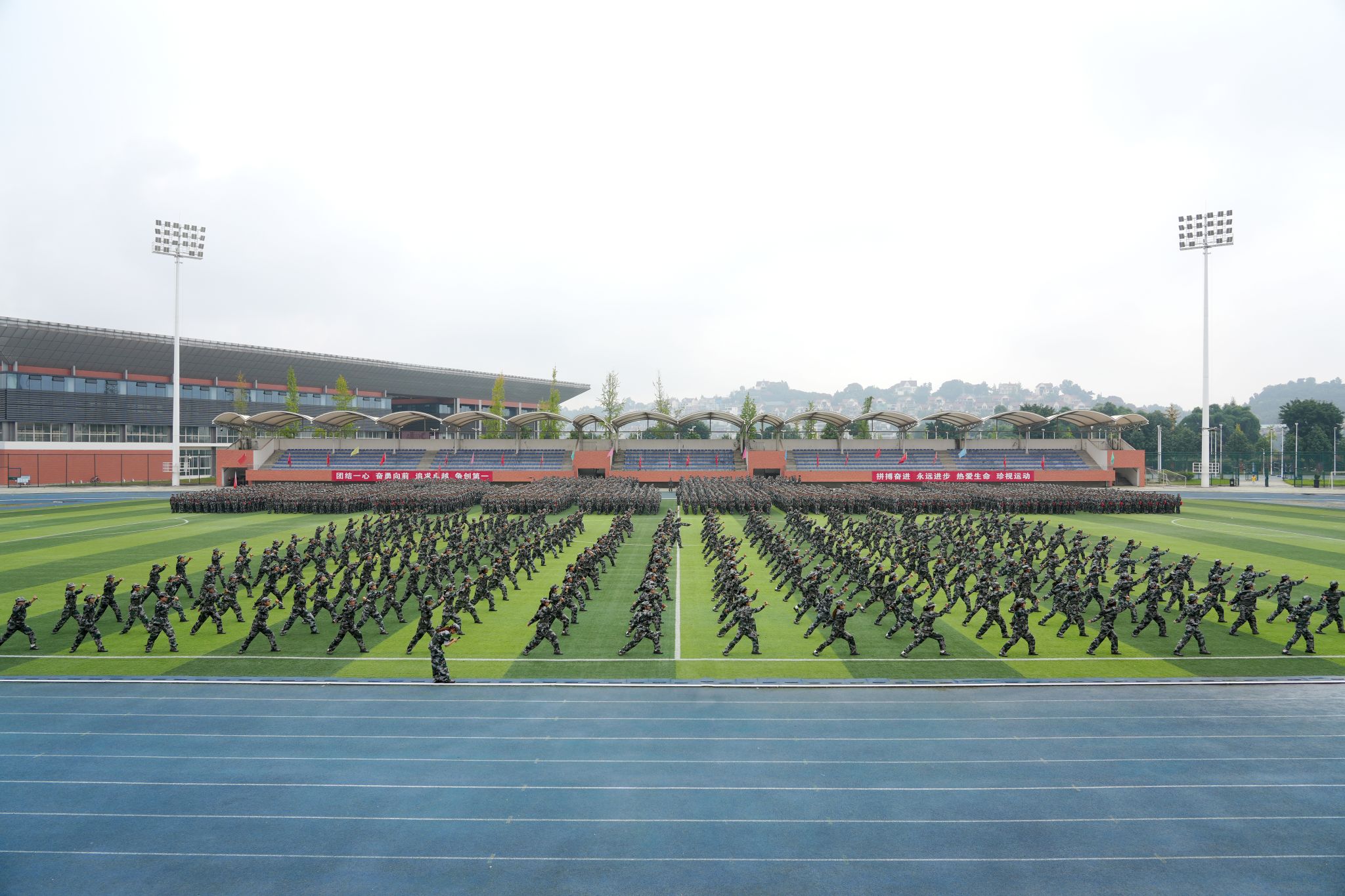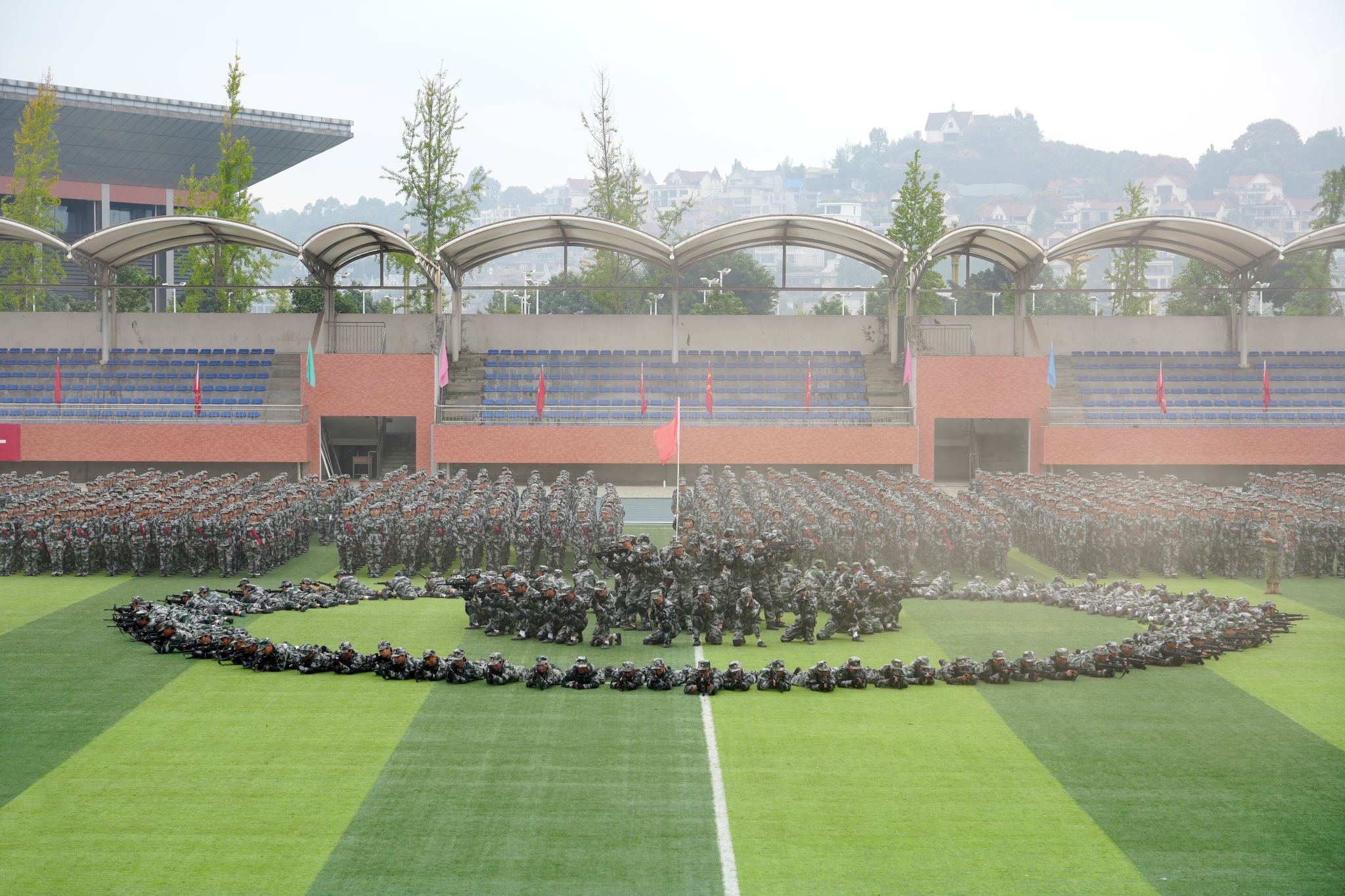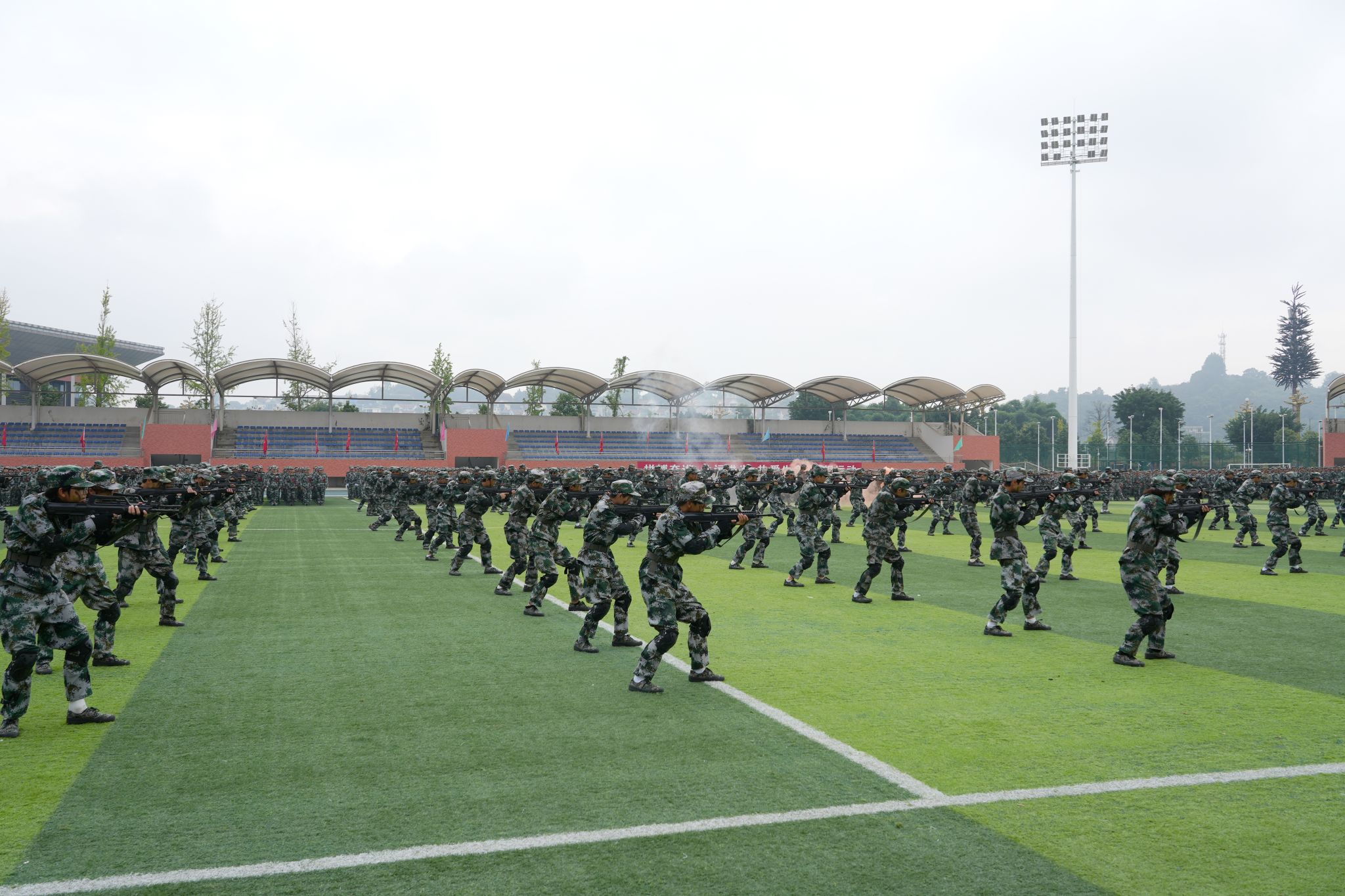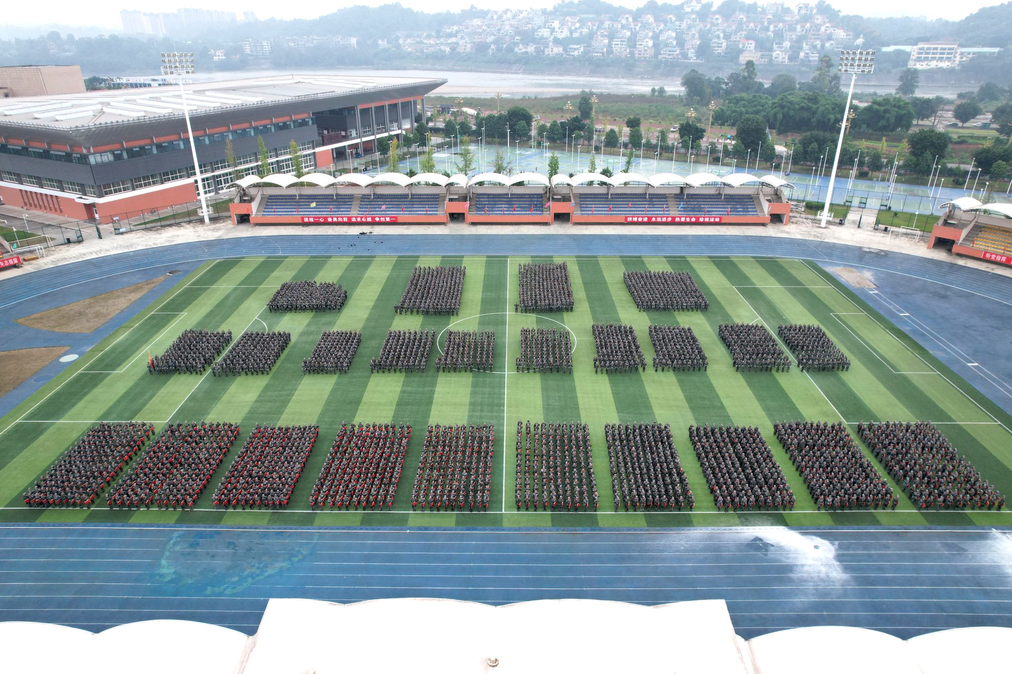 分列式结束后,精彩纷呈的军事科目汇报表演将现场气氛推向高潮。男子军体拳方队动作刚劲有力,喊声震天,尽显阳刚之气;女子匕首操方队步伐敏捷,动作精准,巾帼不让须眉;当欢快的旋律划破天际,1500名学子组成的花式方阵如江河奔涌般入场。激昂的《中国人》旋律此刻响起,这首诞生于香港回归之年的爱国金曲,在青衣江畔焕发出崭新的青春力量!从"铭记"历史到"拓梦"未来,从"团结"一心到"中华"腾飞,八个大字随歌词次第“绽放”,与旁侧方队的手语操交相辉映,无声的赤诚与有声的宣言共同谱写着爱国乐章;“诚信、笃志、求真、创新"的八字校训,不仅是方阵中流动的风景,更是同学们未来前行的风向标。当校训字样渐隐,鲜红的党徽已在方阵中央熠熠生辉,1500颗年轻的心在这一刻与党的脉搏同频共振!整个表演过程组织严密,衔接流畅,充分展示了本次军事训练的丰硕成果。