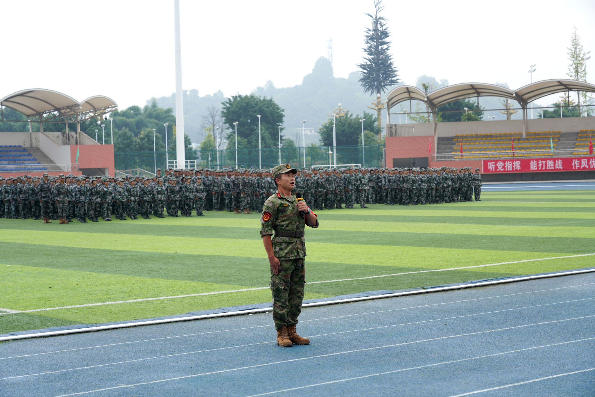 校长刘忠代表学校向承训的全体官兵表示衷心感谢,向顺利完成军训任务的同学们以及受到表彰的集体和个人表示热烈祝贺。他要求全体2025级新生增强国防意识、树立忧患意识、紧跟时代潮流,要把军训中激发出来的团结、拼搏、进取精神带到学习生活中,努力实现科学文化与思想修养的统一,书本知识与社会实践的统一,学有所成,报效祖国。