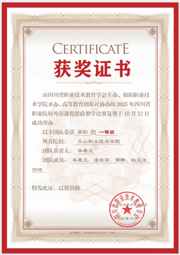 近日,2025年四川省职业院校外语课程思政教学比赛决赛圆满落幕。经过激烈角逐,BV伟德官方网站素质教育学院英语教师辛厚兰、凌浩源、谭静、姚玉洁、何琦组成的参赛团队凭借其深刻的课程思政内涵、创新的教学设计以及精彩的现场发挥,最终获得高职组一等奖的优异成绩。这一佳绩充分展现了伟德官网在外语课程思政教学改革上的显著成果。