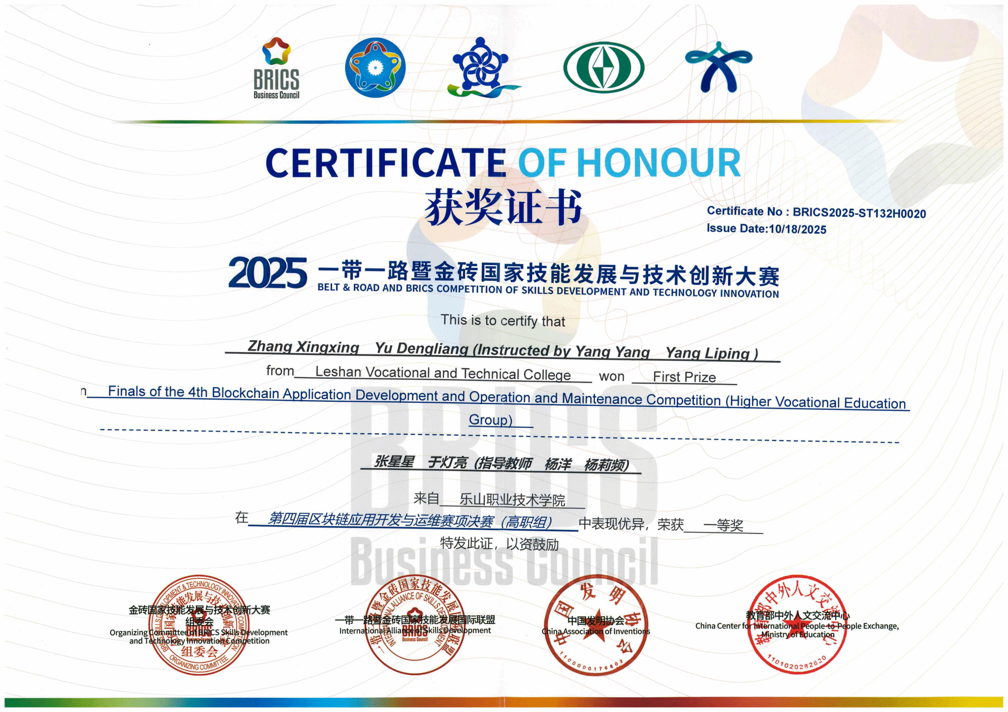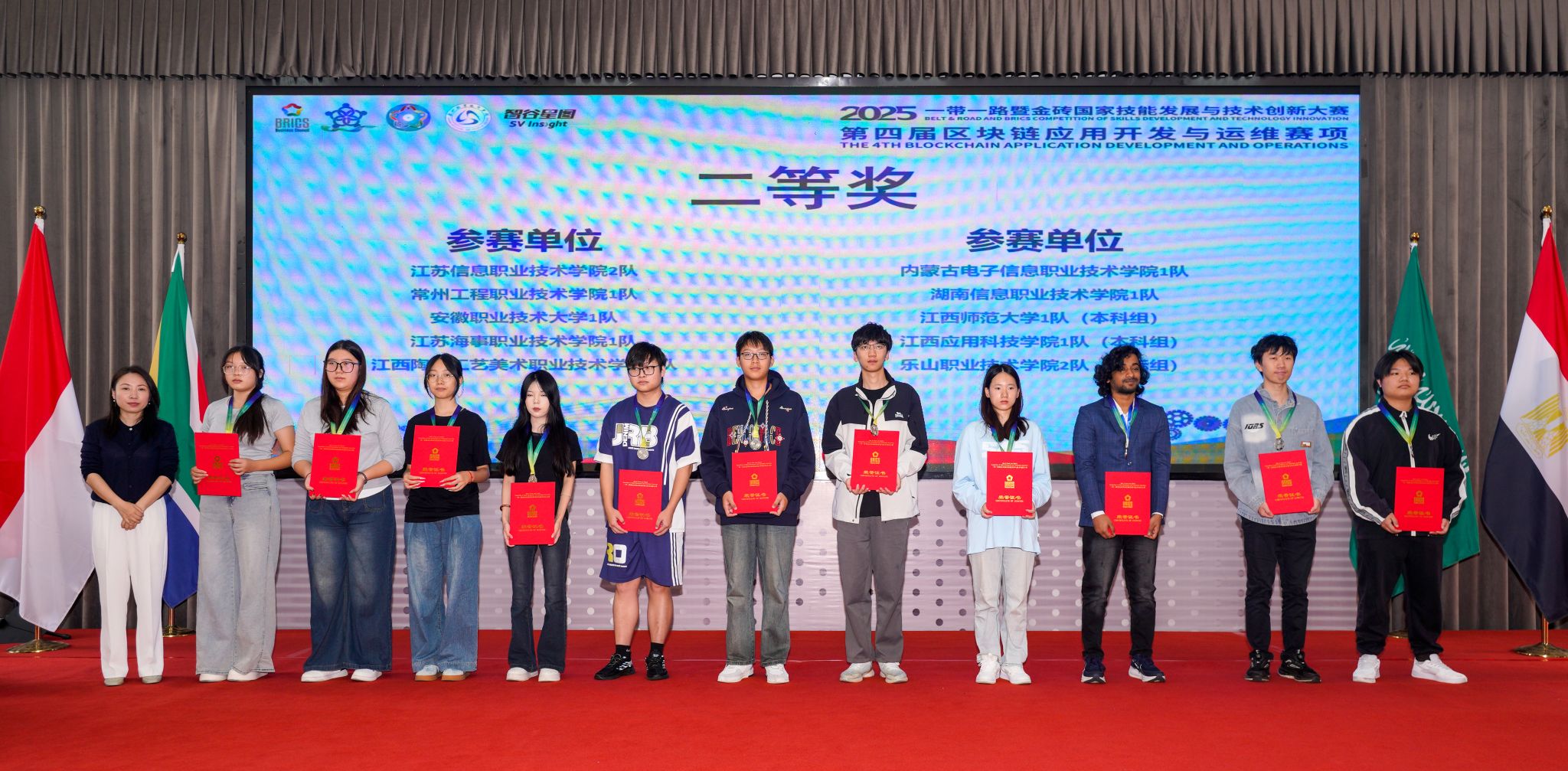 10月17日,2025“一带一路”暨金砖国家技能发展与技术创新大赛之第四届区块链应用开发与运维赛项在伟德官网举行,人工智能学院组织四支队伍参赛。经过紧张激烈的比赛,伟德官网学生共获得高职组、国际组三个一等奖,同时获得国际组二等奖。本届大赛由金砖国家工商理事会中方理事会、“一带一路”暨金砖国家技能发展国际联盟、“一带一路”暨金砖国家技能发展与技术创新培训中心、中国发明协会、教育部中外人文交流中心主办。伟德官网作为联合承办单位之一承办了本次比赛。