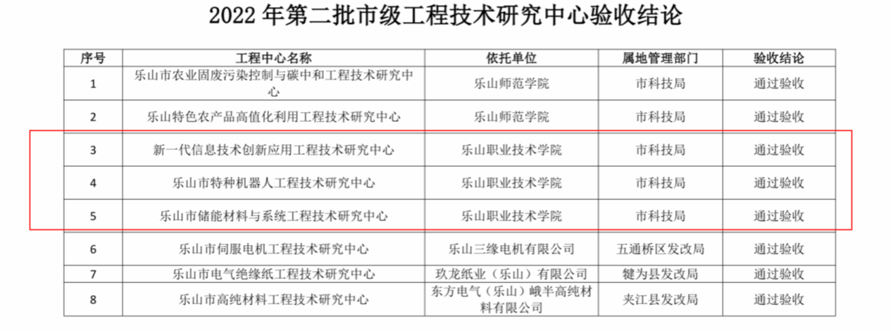 8月,2022年申报组建的“新一代信息技术创新应用工程技术研究中心”、 “乐山市特种机器人工程技术研究中心”“乐山市储能材料与系统工程技术研究中心”等3个工程技术研究中心顺利通过乐山市科学技术局验收。3个平台将依托学校新能源材料、智能制造、人工智能等优势专业群,联合行业龙头企业开展协同创新,推动乐山高端装备制造与新能源产业"加速跑"。