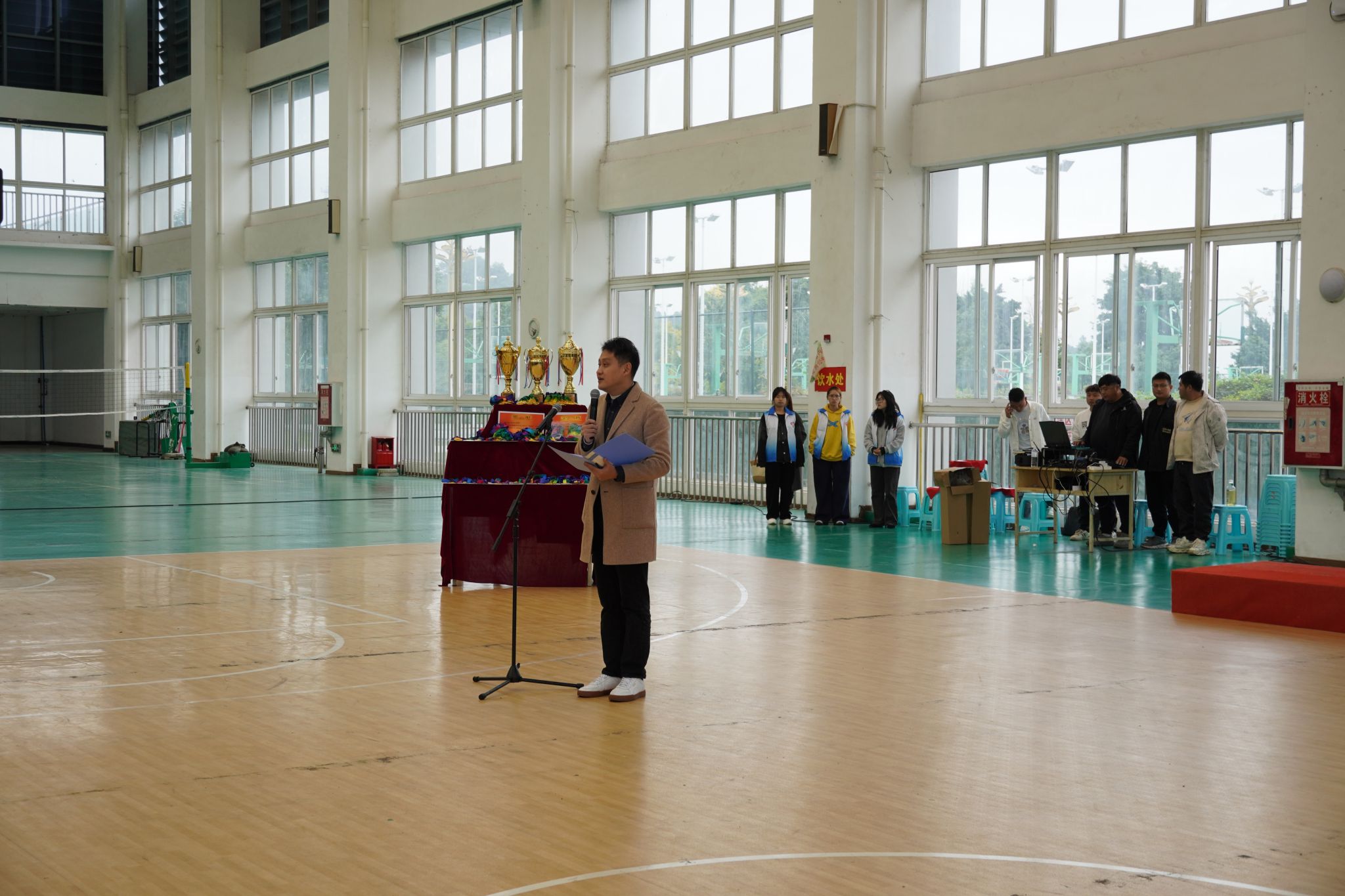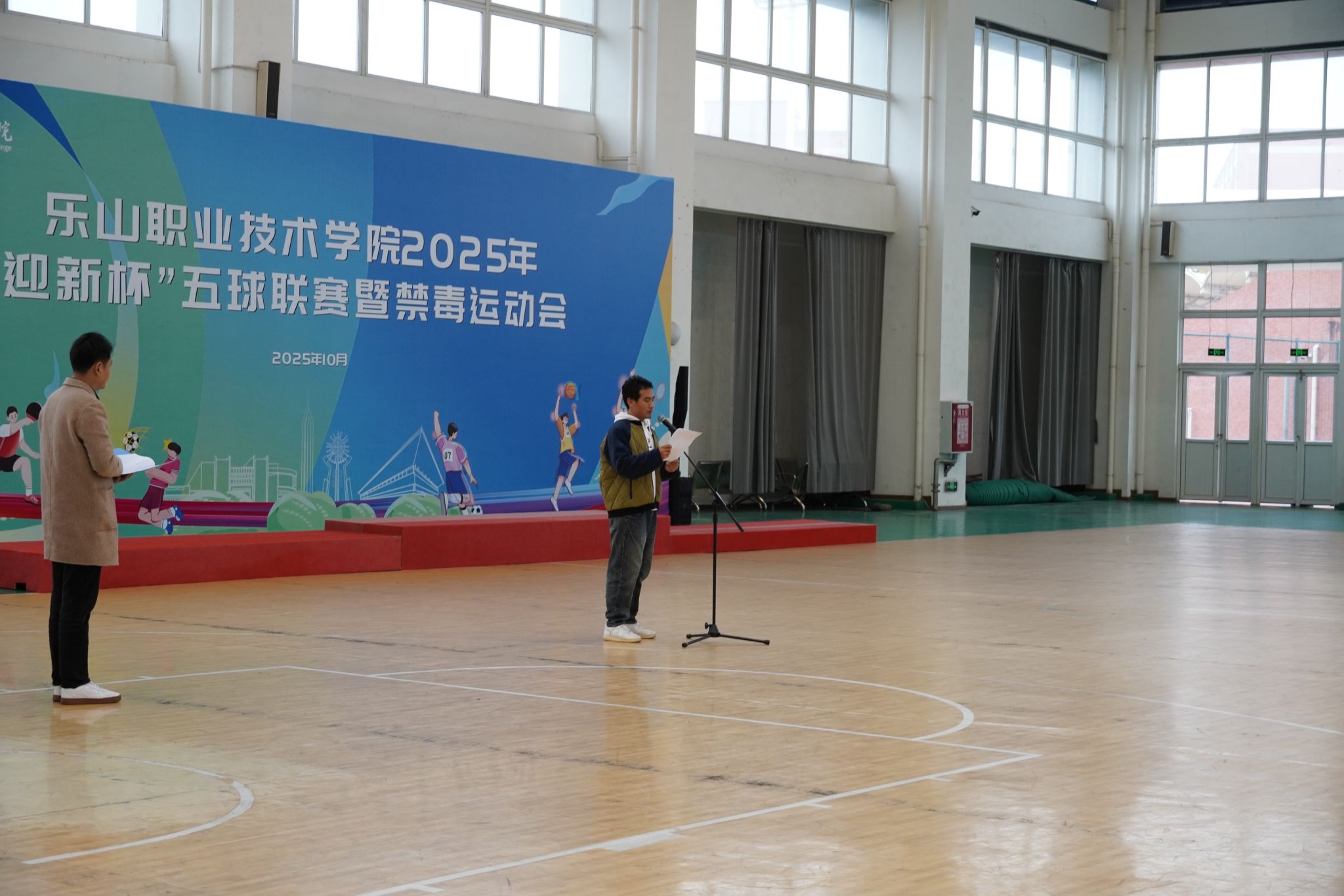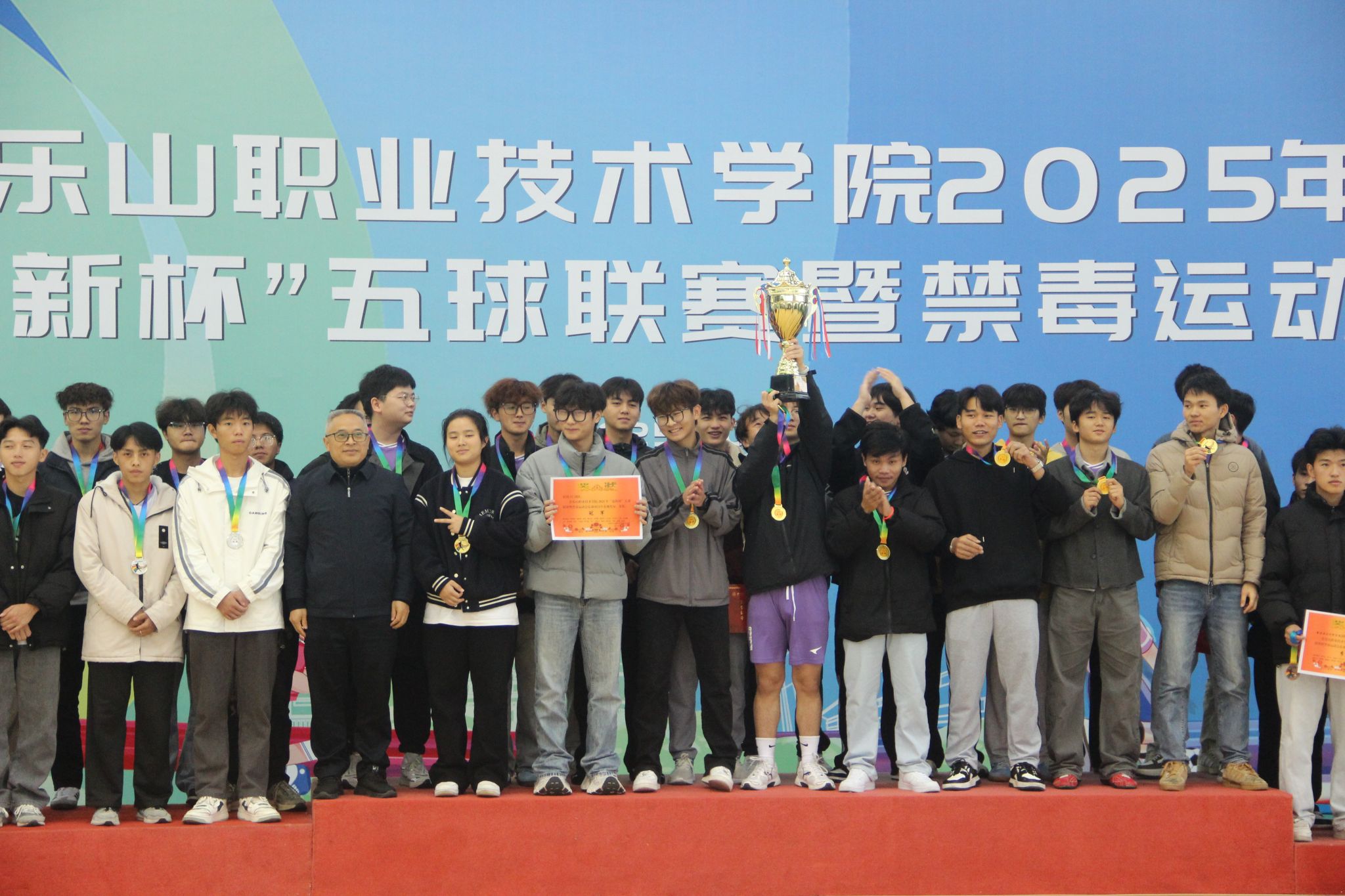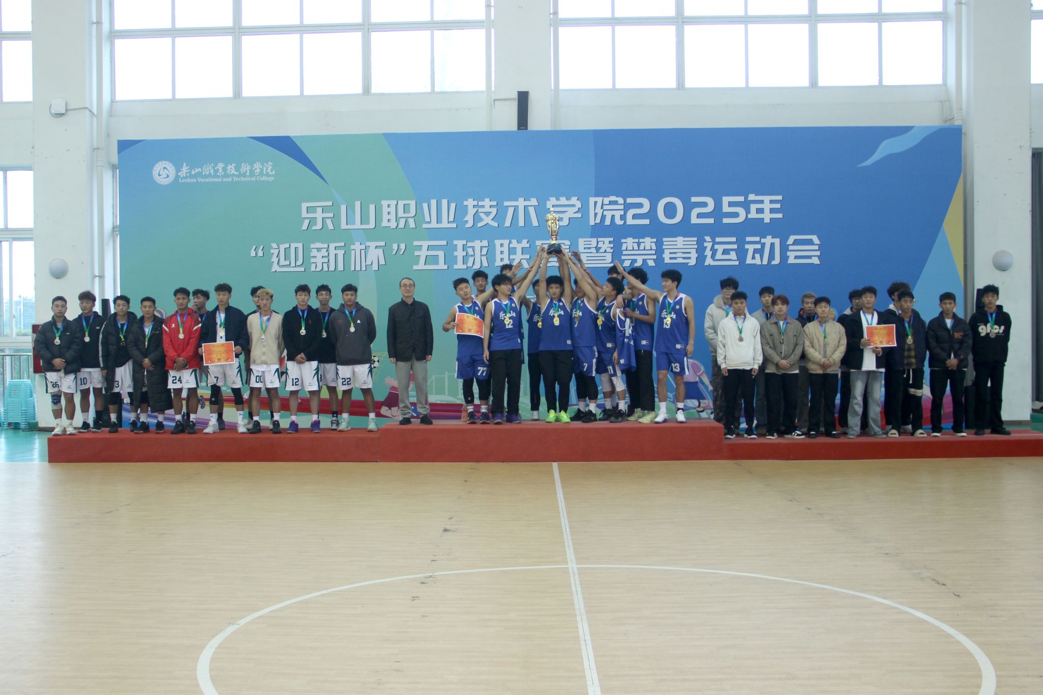 11 月 12 日 ,BV伟德官方网站2025年“迎新杯”五球联赛暨禁毒运动会闭幕式暨颁奖仪式在体育馆隆重举行。校长刘忠,党委委员、副校长张学河,学生工作部副部长叶利丽,体育学院副院长范辰,总裁判长张繁,赞助商京东校园馆经理吴娇娇及全体参赛运动员齐聚现场,闭幕式由校团委副书记(主持工作)罗贤主持。