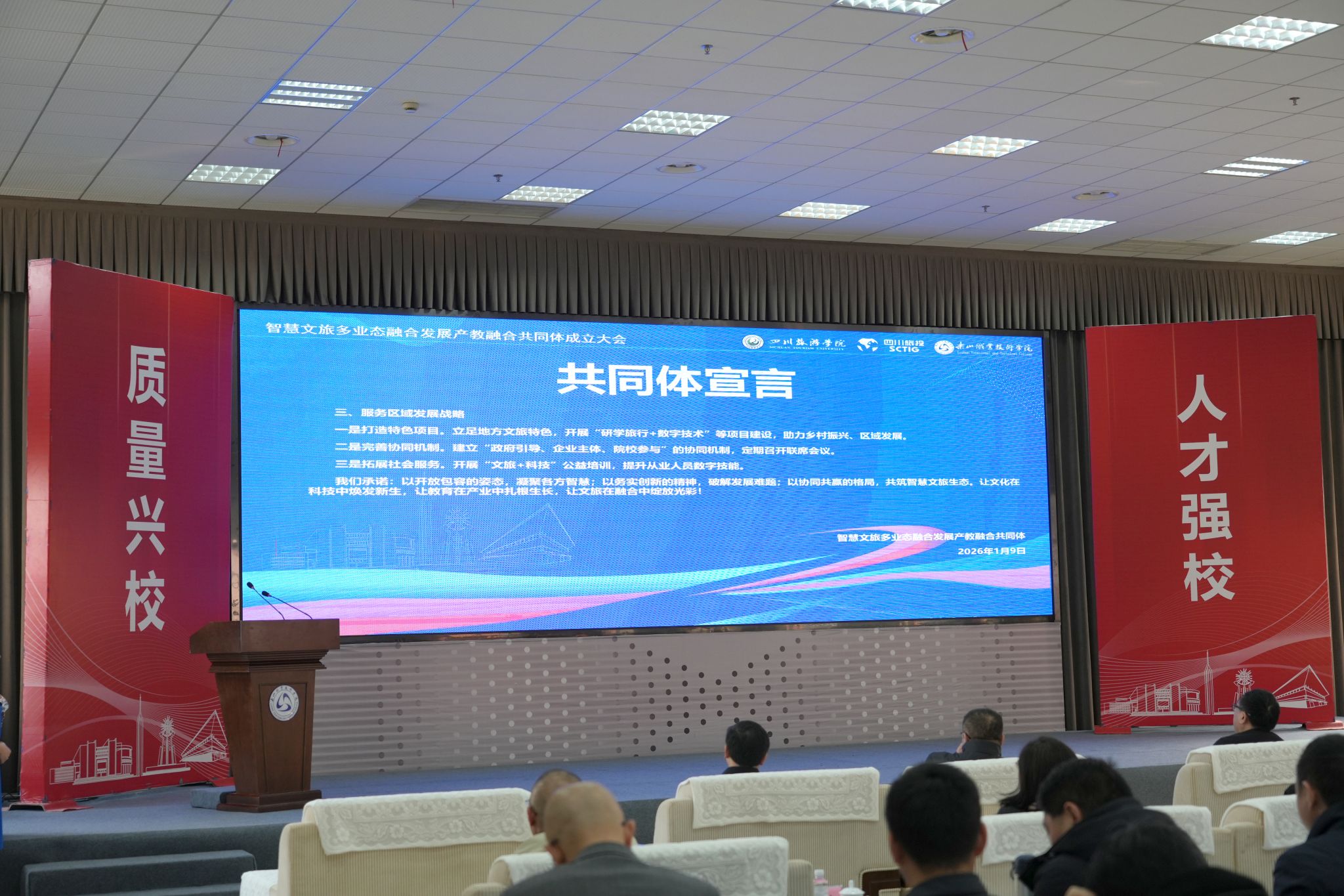 1月9日,智慧文旅多业态融合发展产教融合共同体成立大会在BV伟德官方网站隆重举行,共同体由四川旅游学院、四川省旅游投资集团有限责任公司、BV伟德官方网站联合发起,以“智融文旅・产教协同 共筑多业态融合发展新生态”为主题,旨在推动文旅多业态深度融合,整合行业优质资源,构建文旅产教融合新生态。来自省内外80余家院校和企业150余名代表参会。