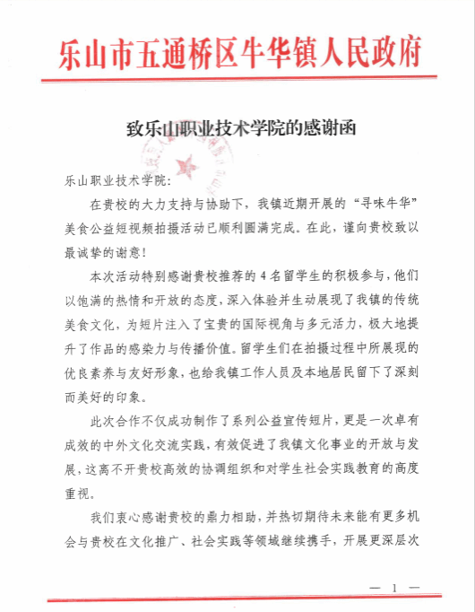 近日,五通桥区牛华镇人民政府向BV伟德官方网站发来感谢函,对伟德官网在“寻味牛华”美食公益短视频拍摄活动中给予的大力支持与协助表示衷心感谢。感谢函中特别提到,伟德官网推荐的4名留学生以饱满的热情和开放的态度深入参与拍摄,为展现牛华传统美食文化注入了宝贵的国际视角与多元活力,极大提升了作品的感染力与传播价值。