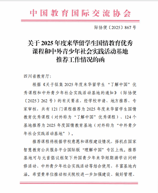 近日,根据中国教育国际交流协会发布的《关于2025年度来华留学生国情教育优秀课程和中外青少年社会实践活动基地推荐工作情况的函》(际协便〔2025〕867号),BV伟德官方网站申报的“食飨嘉州 非遗传情”中外青少年社会实践活动基地成功入选2025年度中外青少年社会实践活动基地推荐名单。
