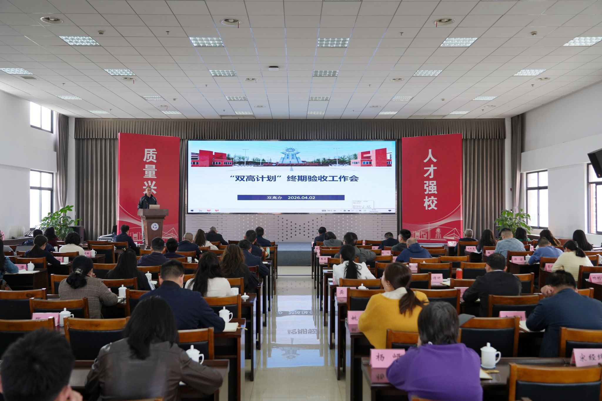 党委书记成定彬讲话,一要提高政治站位,把验收工作摆在当前首要位置,统一思想、狠抓落实;二要对标对表补齐短板,紧扣绩效指标倒排工期,深挖办学特色与服务成效,凝练“乐职经验”;三要压实工作责任,坚持“谁填报、谁负责”,强化部门协同,形成全校“一盘棋”工作格局。