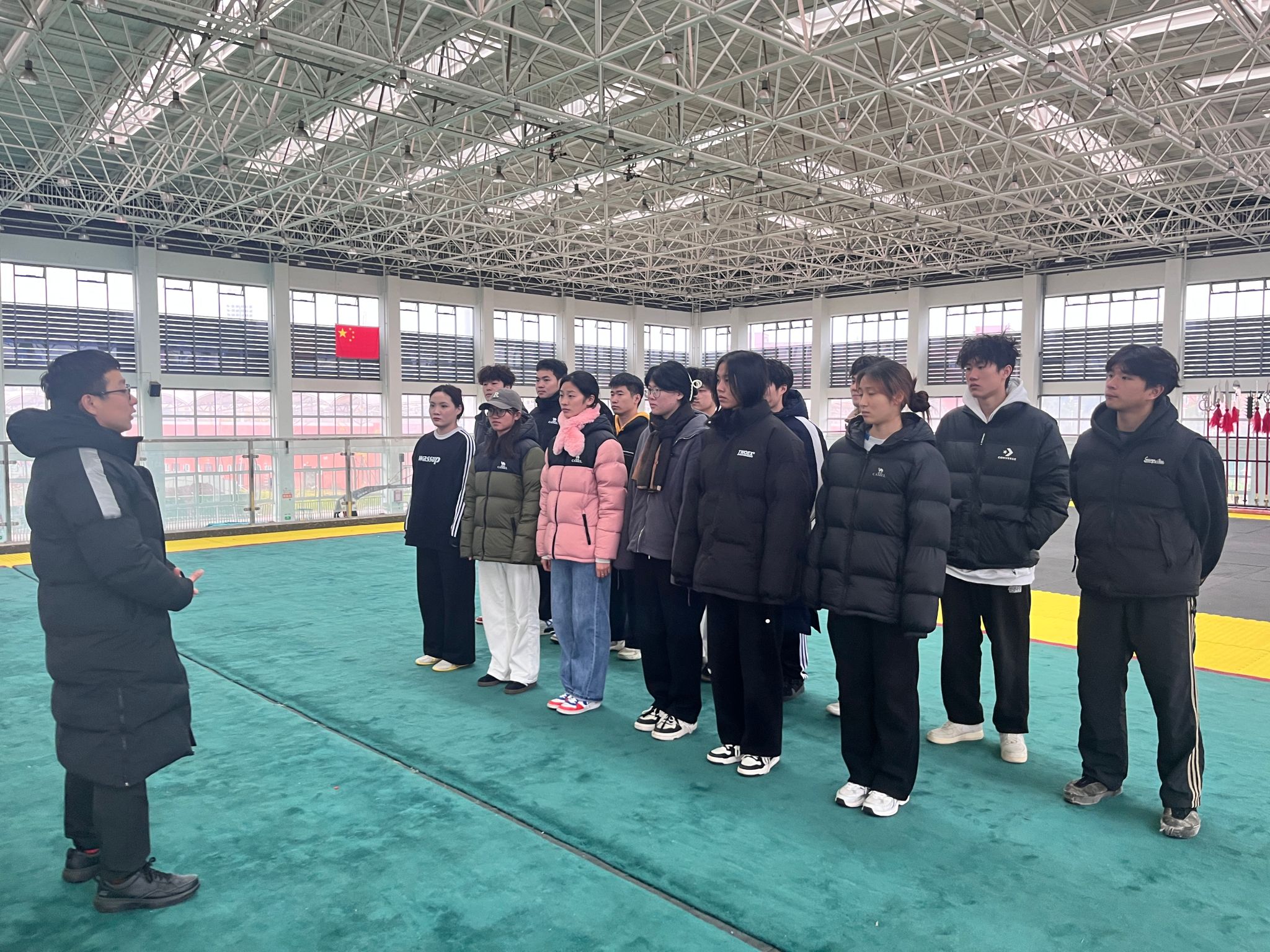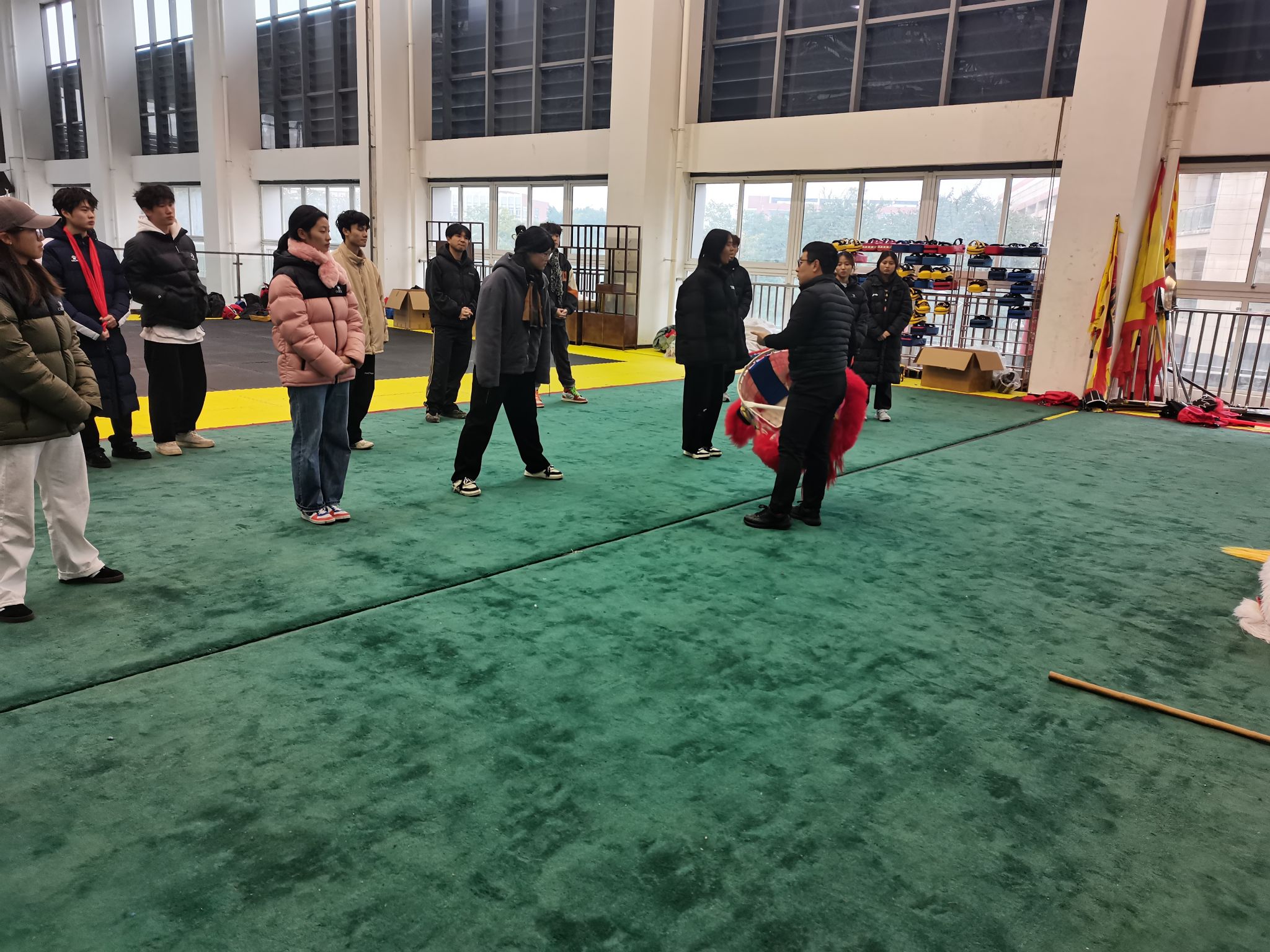 活动于2024年12月13日正式拉开帷幕。在下午2:30-5:30的时间段内,冯剑老师首先带领同学们进行了舞狮节目的混合编排。通过这一环节,同学们不仅学习了如何将不同的舞狮动作和技巧巧妙融合,还深刻体会到了团队协作在舞狮表演中的重要性。