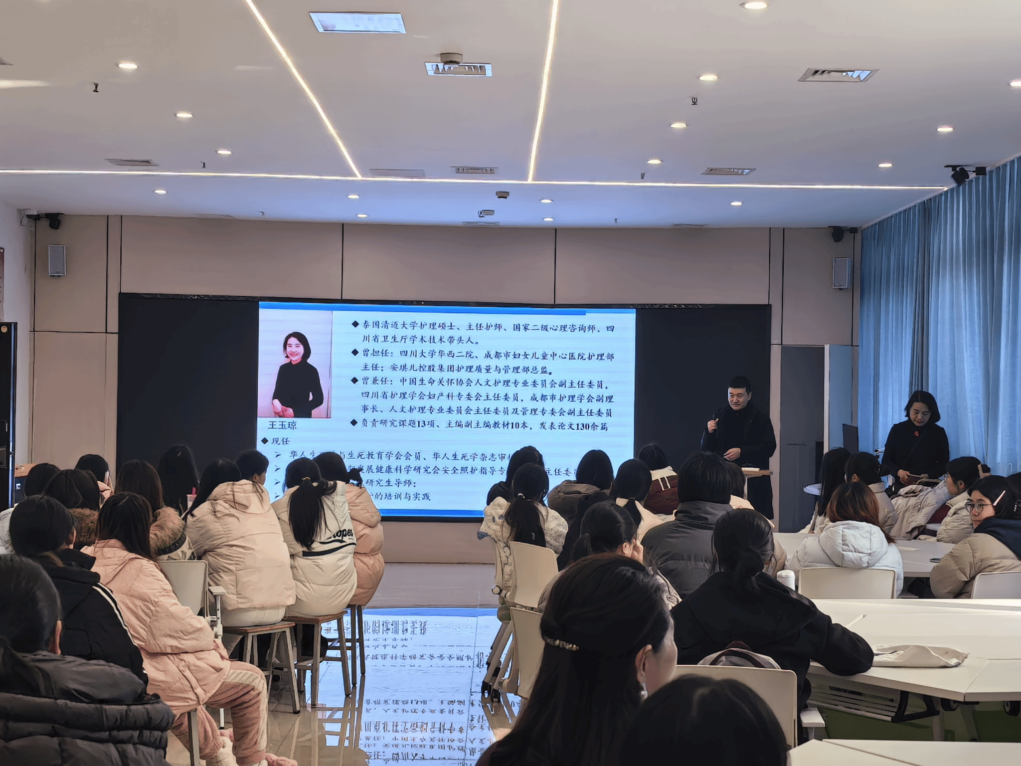 为积极响应新时代健康服务人才培养要求,深化人文关怀课程体系建设与人文教育内涵建设,近日,护理康养学院举办“教学过程中的生死教育”专题讲座暨教学研讨会。活动特邀华人生死学与生死教育学会会员、四川省卫生厅学术技术带头人王玉琼教授主讲,学院全体专任教师和老年保健与管理专业学生共同参与,围绕生死教育的理念、教学与实践展开深度交流与研讨。