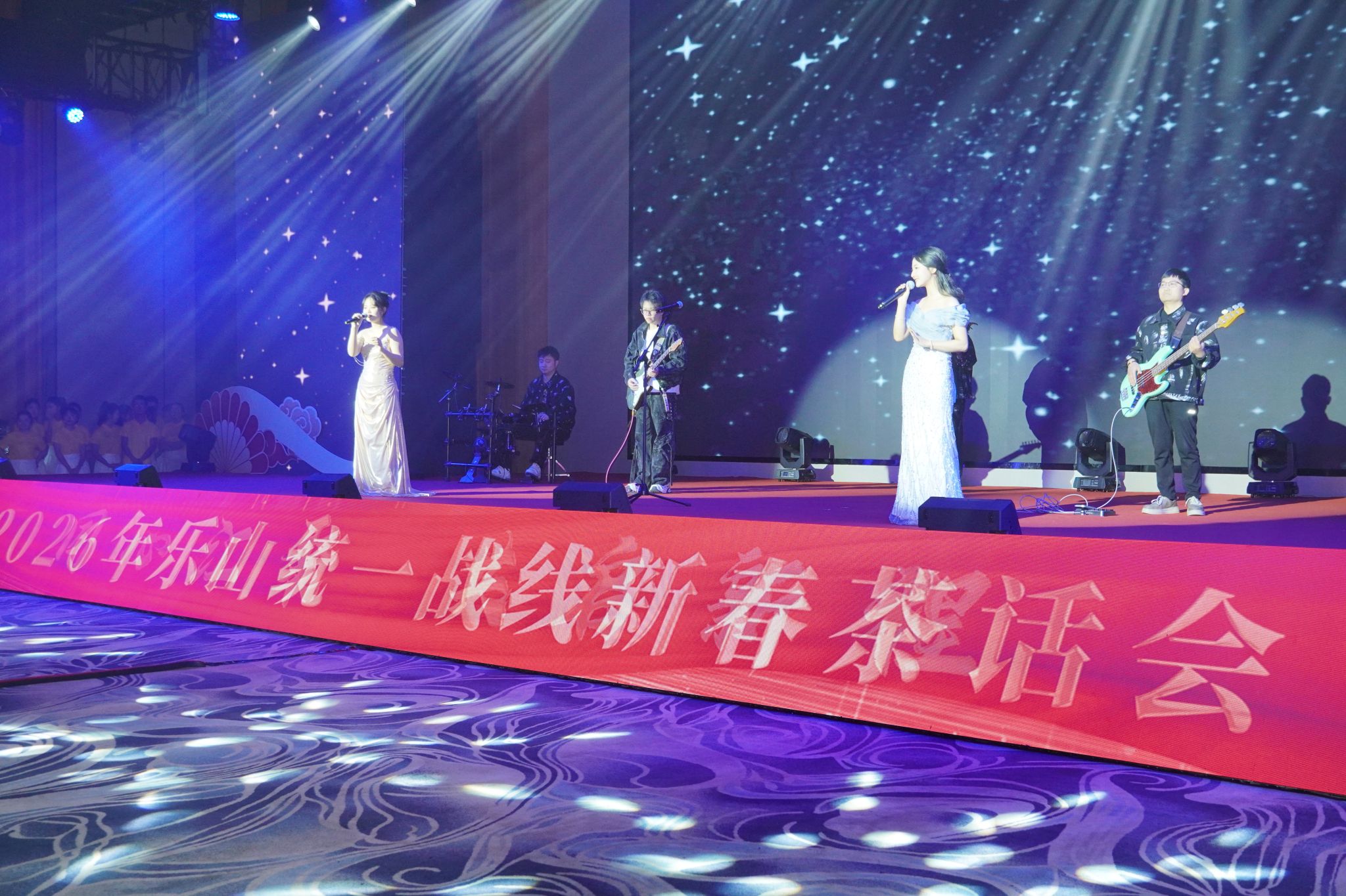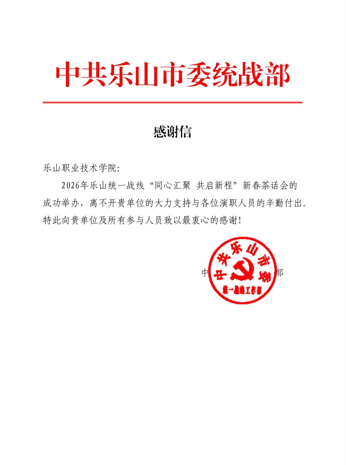 1月27日,由市委统战部联合乐山市商业银行主办的“同心汇聚 共启新程”2026年乐山统一战线新春茶话会成功举行。伟德官网欧其秀佳和刘若萱两位学生代表受邀登台,精彩演绎了歌曲《飞云之下》,以清澈歌声和青春风采,为茶话会增添了温暖而昂扬的艺术氛围,展现了新时代青年学生积极向上的精神面貌。
