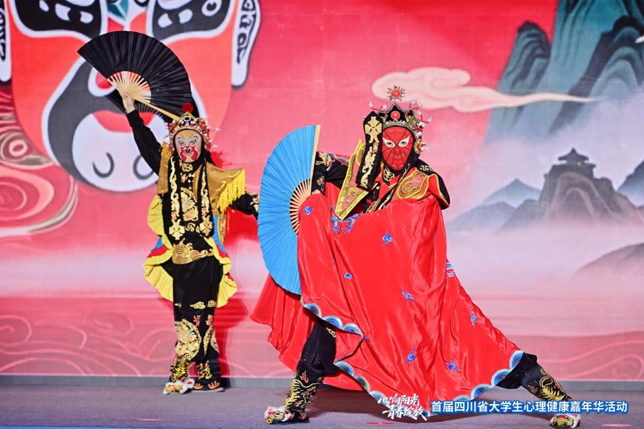 学校原创节目《元气脸谱·锦氏调理操》进行了舞台展演。本节目由学校“悦心”心理健康教育名师工作室、新能源与材料学院联合创作,以“传统养心·形神共调”为主题,创新融合八段锦养生功法与川剧变脸艺术,在动静结合中传递健康理念,兼具美育、体育与心育作用,赢得现场高校师生一致赞誉。