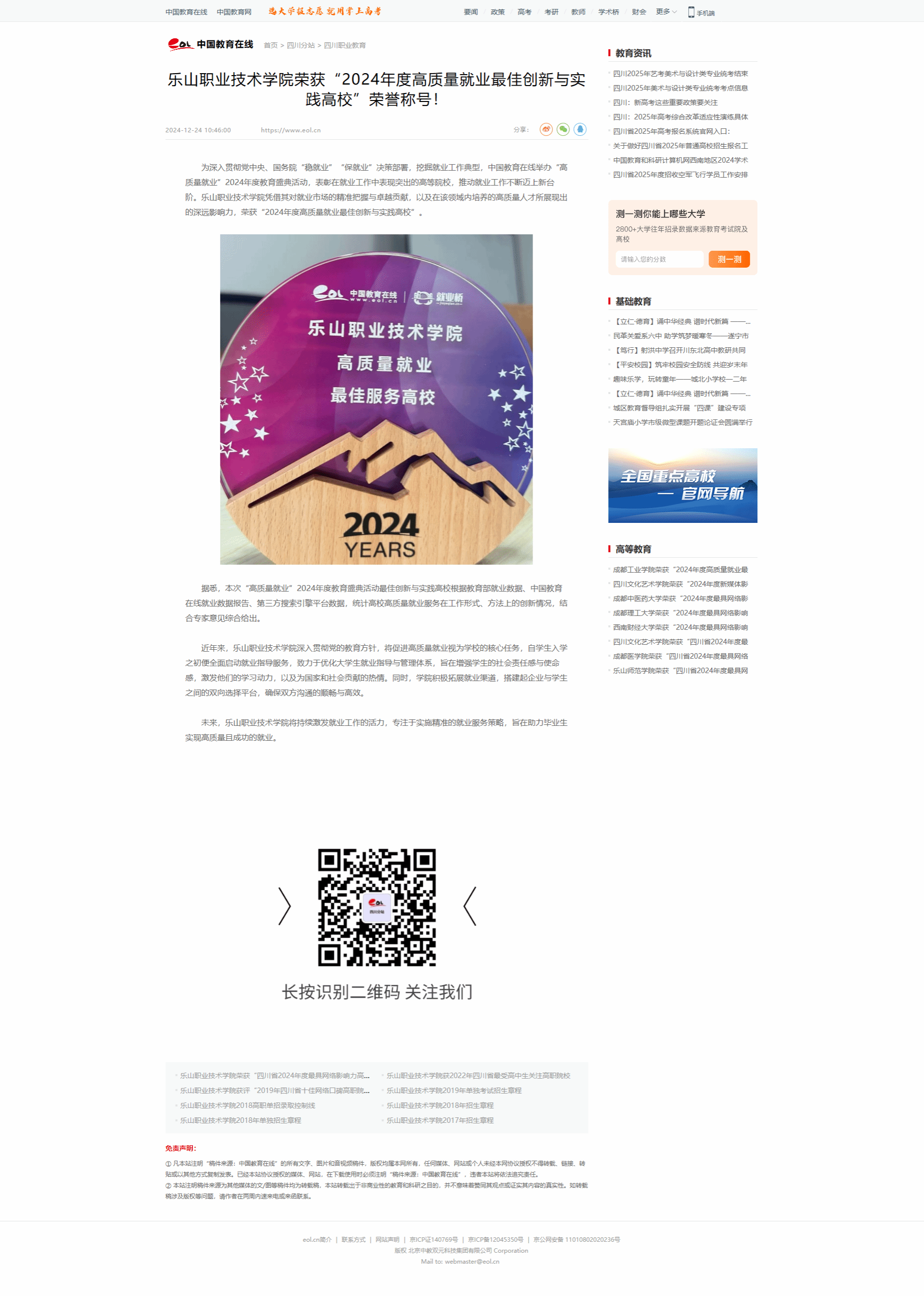 中国教育战线:BV伟德官方网站荣获“2024年度高质量就业最佳创新与实践高校”荣誉称号!