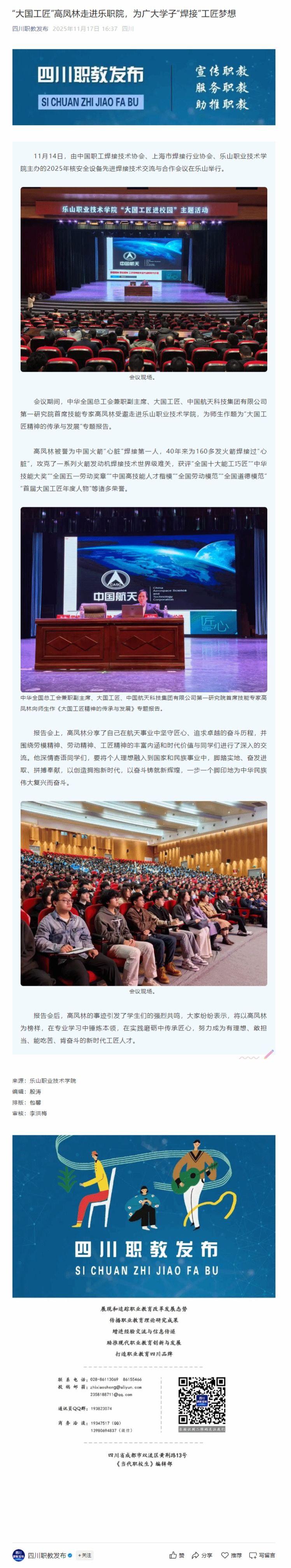 四川职教发布:“大国工匠”高凤林走进乐职院,为广大学子“焊接”工匠梦想