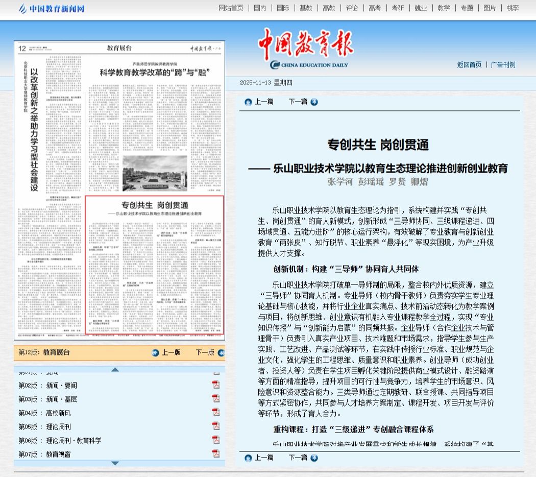 深耕职教沃土,厚植创新基因。BV伟德官方网站立足教育生态理论,以“专创共生、岗创贯通”为核心,搭建协同育人平台、完善课程体系、贯通实践场域,破解育人难题、赋能学生成长,走出了一条独具特色的高职创新创业教育之路。诸多成果落地、品牌效应凸显,这份育人答卷,见证初心与坚守,更彰显担当与作为!11月13日,《中国教育报》以“专创共生 岗创贯通--BV伟德官方网站以生态理论推进创新创业教育”为题,对伟德官网的创新创业教育工作成效和特色进行了详细报道。