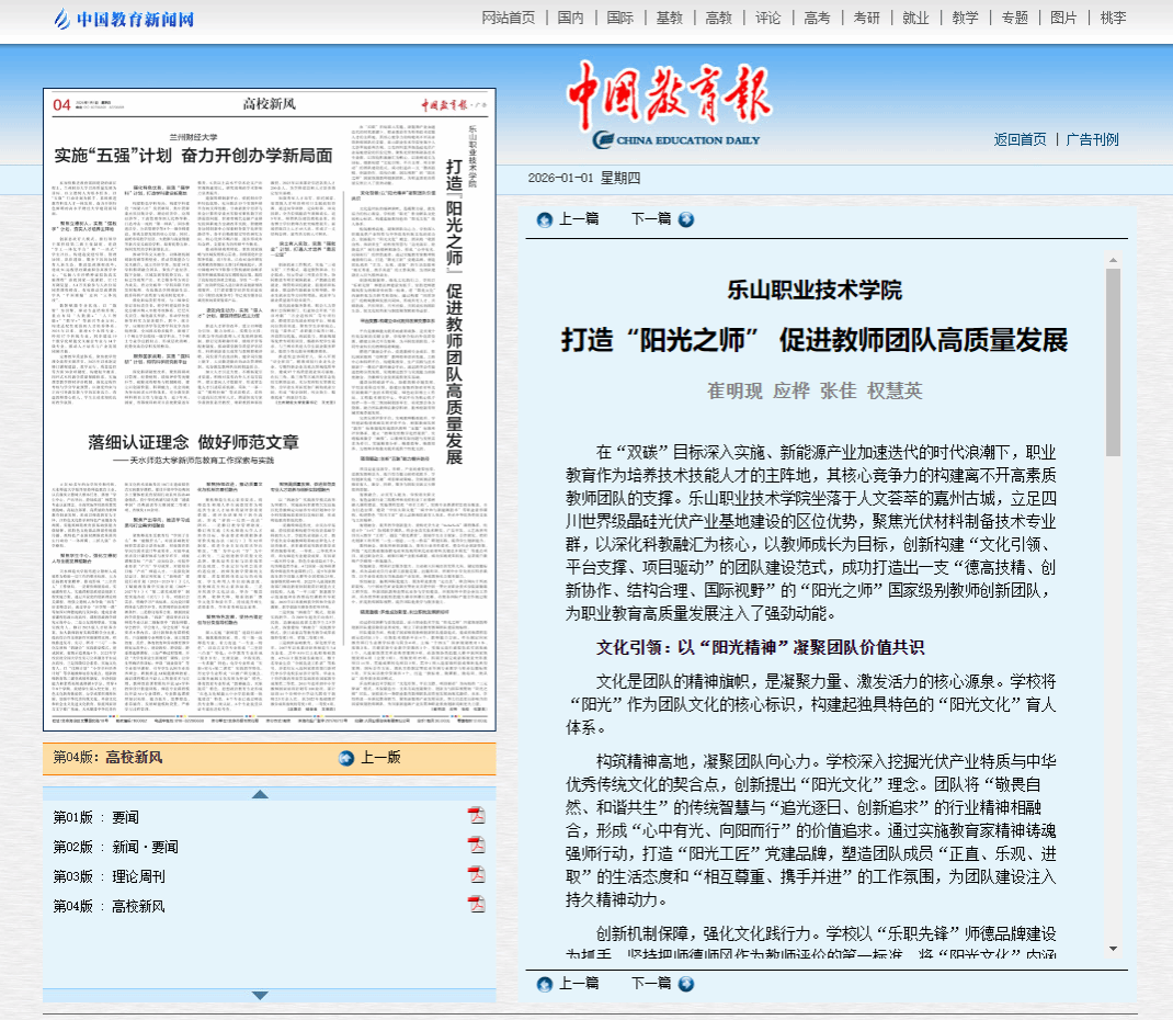 从文化铸魂到平台赋能,从项目驱动到硕果满枝,这支扎根地方产业的教师队伍,正以“德高技精、创新协作”的姿态,书写着职业教育赋能区域发展的鲜活答卷。2026年1月1日,《中国教育报》以“打造‘阳光之师’促进教师团队高质量发展”为题,对BV伟德官方网站创新构建“文化引领、平台支撑、项目驱动”的团队建设范式,成功打造出一支“德高技精、创新协作、结构合理、国际视野”的“阳光之师”国家级别教师创新团队进行了详细报道。