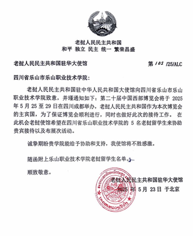 近日,BV伟德官方网站收到老挝人民民主共和国驻华大使馆发来的正式函件,专程邀请伟德官网5名优秀的老挝籍留学生,参与5月25日-29日第二十届中国西部国际博览会的贵宾接待与展馆布展工作。这封特殊的邀请函,标志着BV伟德官方网站在澜湄区域国际化人才培养领域获得官方认可,成为四川省首个获老挝驻华使馆专项邀约参与国家级展会服务的高职院校。