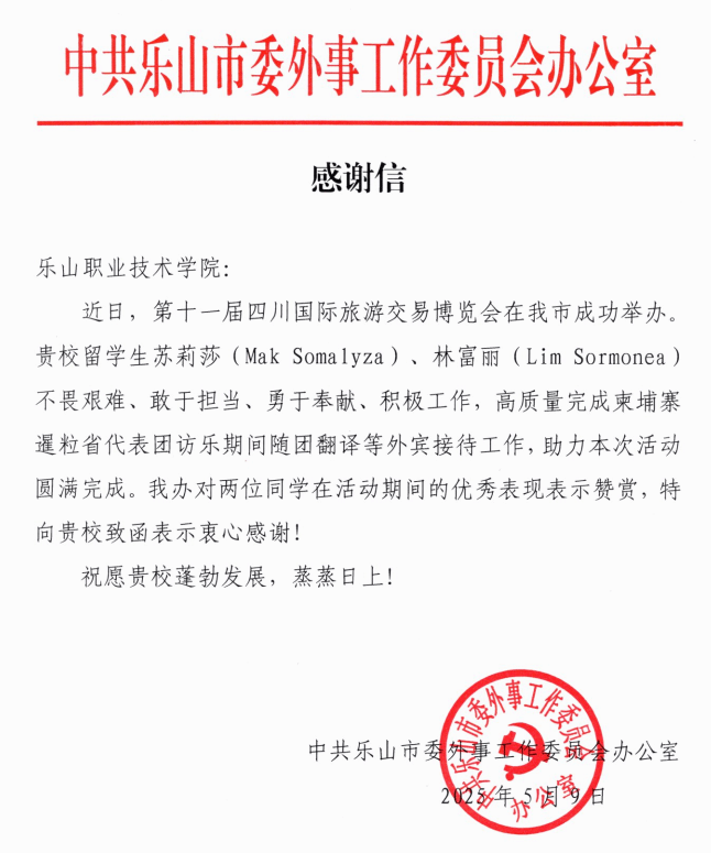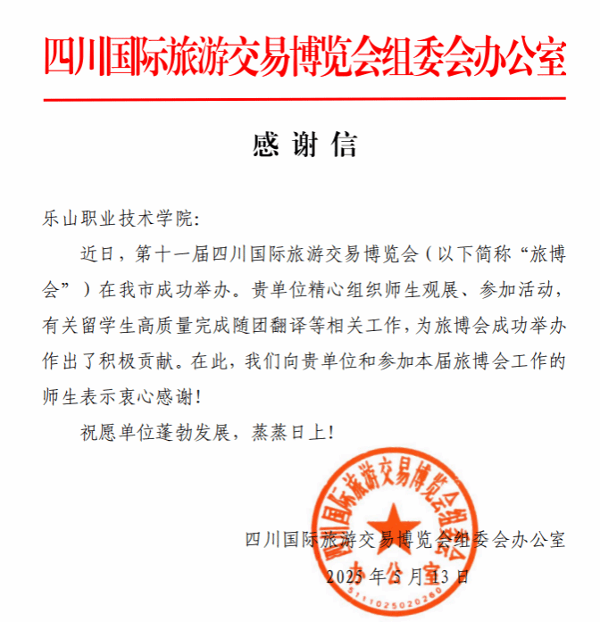 中共乐山市委外事工作委员会办公室及四川国际旅游交易博览会组委会办公室分别向伟德官网发来感谢信,对参与旅博会工作的学生表示衷心感谢,并对苏莉莎、林富丽等同学的优秀表现给予了高度赞赏。伟德官网来华留学生以实际行动诠释了奉献精神,为学校赢得了荣誉,也为伟德官网国际化办学增添了新的光彩。